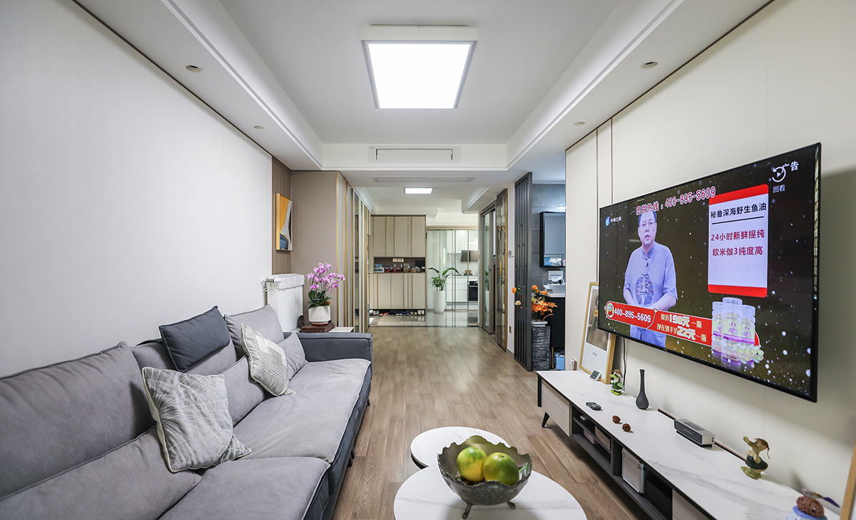 客廳開間不算太大,電視墻做纖維大板,用金屬線條做點(diǎn)綴,更顯簡單大氣,加上落地電視柜,75寸電視機(jī)掛墻,空間上也很寬裕。吊頂造型上采用雙眼皮吊頂。地面采用地板,整個客廳的溫馨感也提升一個層次。造型和色調(diào)上無不給人以簡潔、大氣、時尚的感覺。