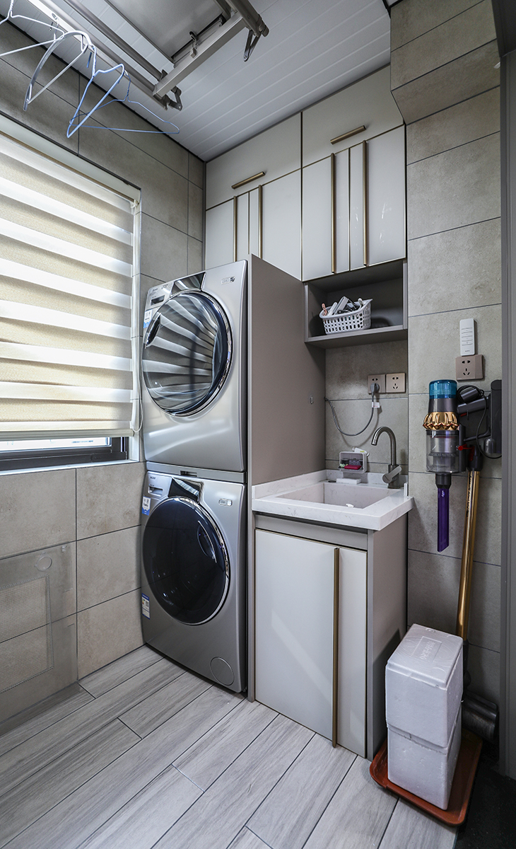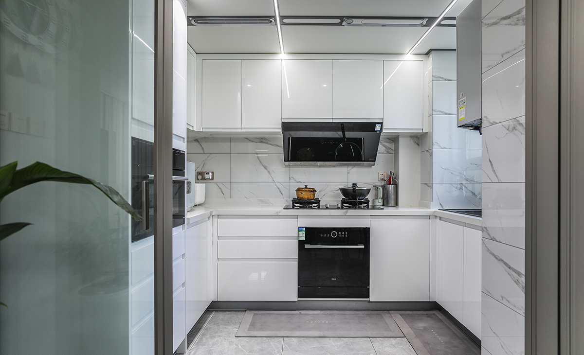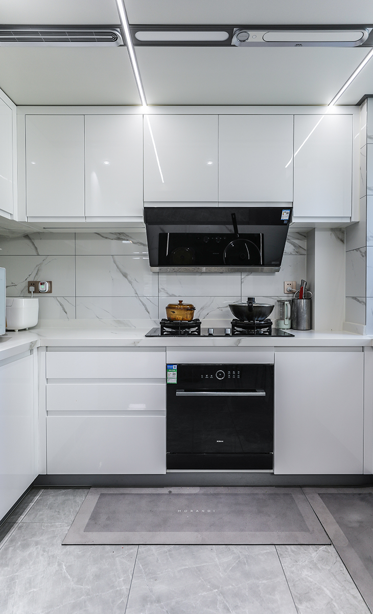 廚房吊頂我們用了大板的集成吊頂,整體性更強(qiáng),配上線型燈,線性排風(fēng)美觀實(shí)用都兼顧到了。櫥柜整體也用的是白色調(diào),配合硬裝的白色墻磚,灰色地磚,廚房這個空間真的很舒適,做起菜來也是別有一番風(fēng)味,妥妥的米其林廚房沒錯了。