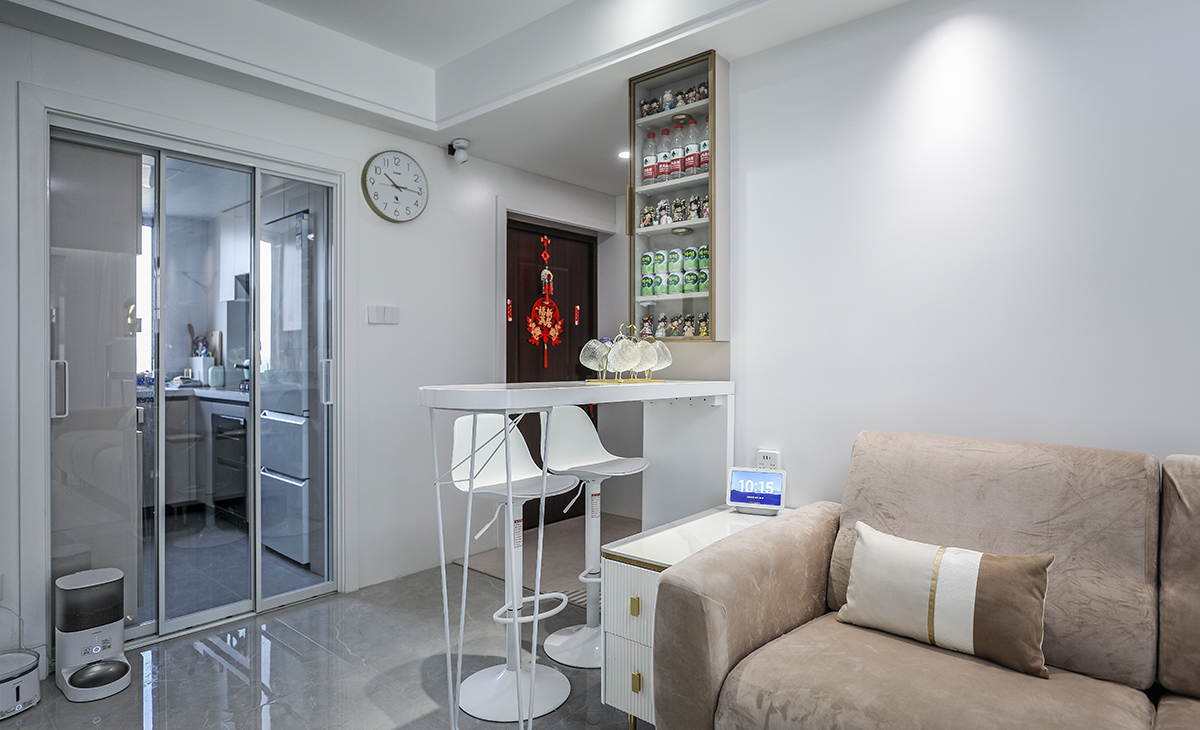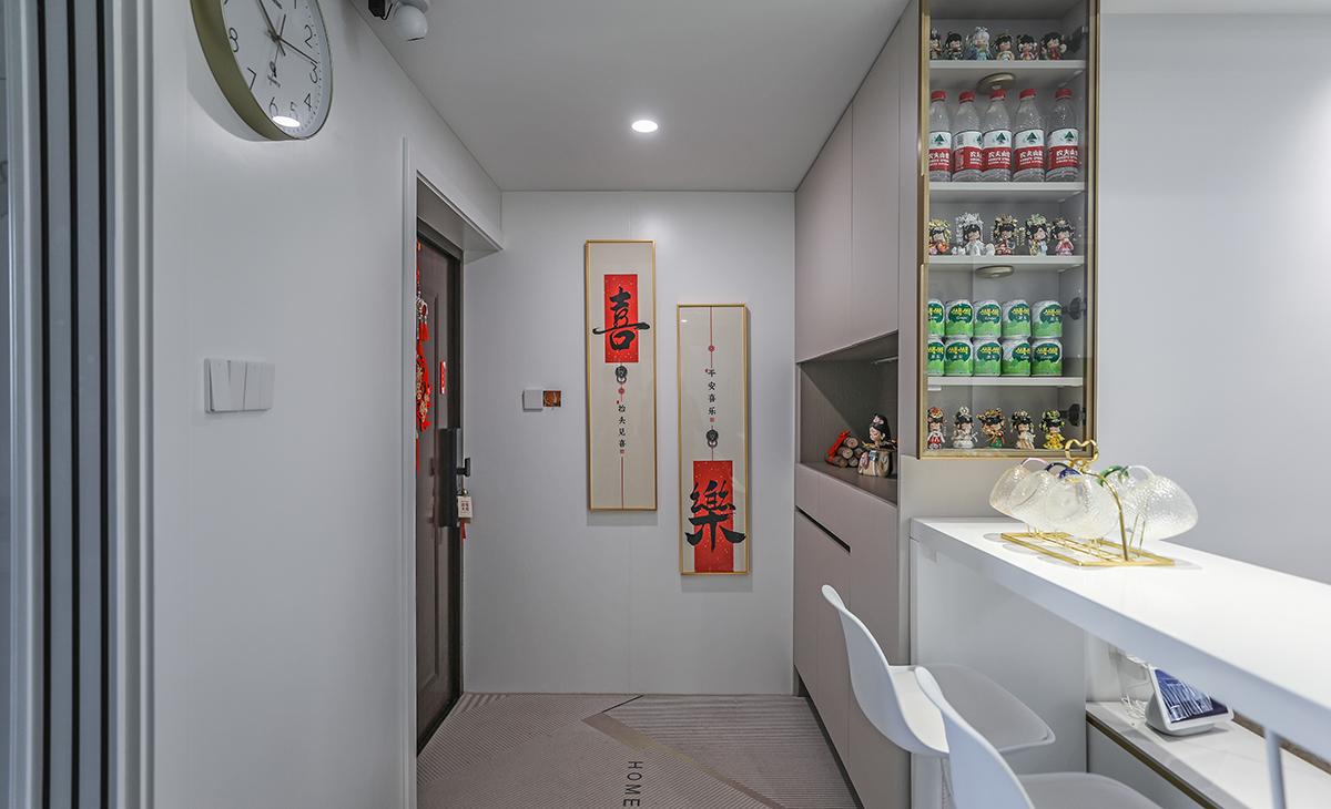 進戶門對面做玄關柜+鞋柜組合,利于玄關側面做一組裝飾柜,鏈接吧臺,更顯得時尚年輕,上面做玻璃門+燈帶展示。墻面同色護墻板,防止家中寵物抓劃墻面。