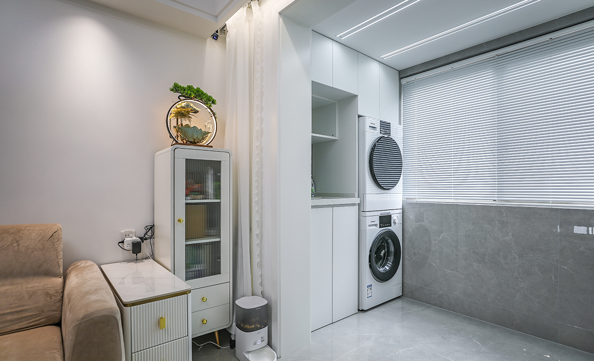 陽臺一邊做洗衣區,烘干機+洗衣機整體疊放更剩空間,左邊增加臺盆,用于清洗小物件,臺盆下方增加內衣機,完美利用每一份空間,一邊做寵物區,業主兩只狗狗休息區上不利用空間做寵物平時的食物以及設備。