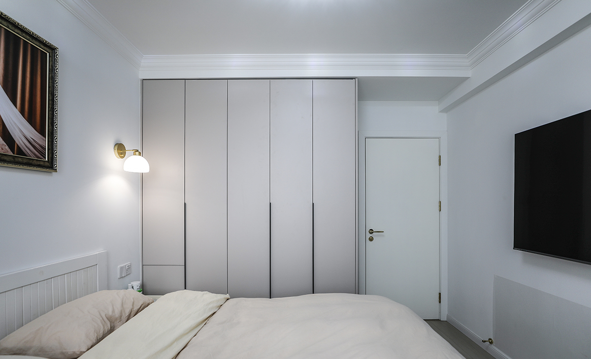 主臥頂面石膏線走邊,不做復雜背景和線條,掛一些裝飾畫,家具更顯自然協調,墻面淺色涂料,1.8床左邊床頭柜右邊梳妝臺,衣柜靠近床頭柜單獨設計門板,更方便實用,整體空間簡單實用為主。