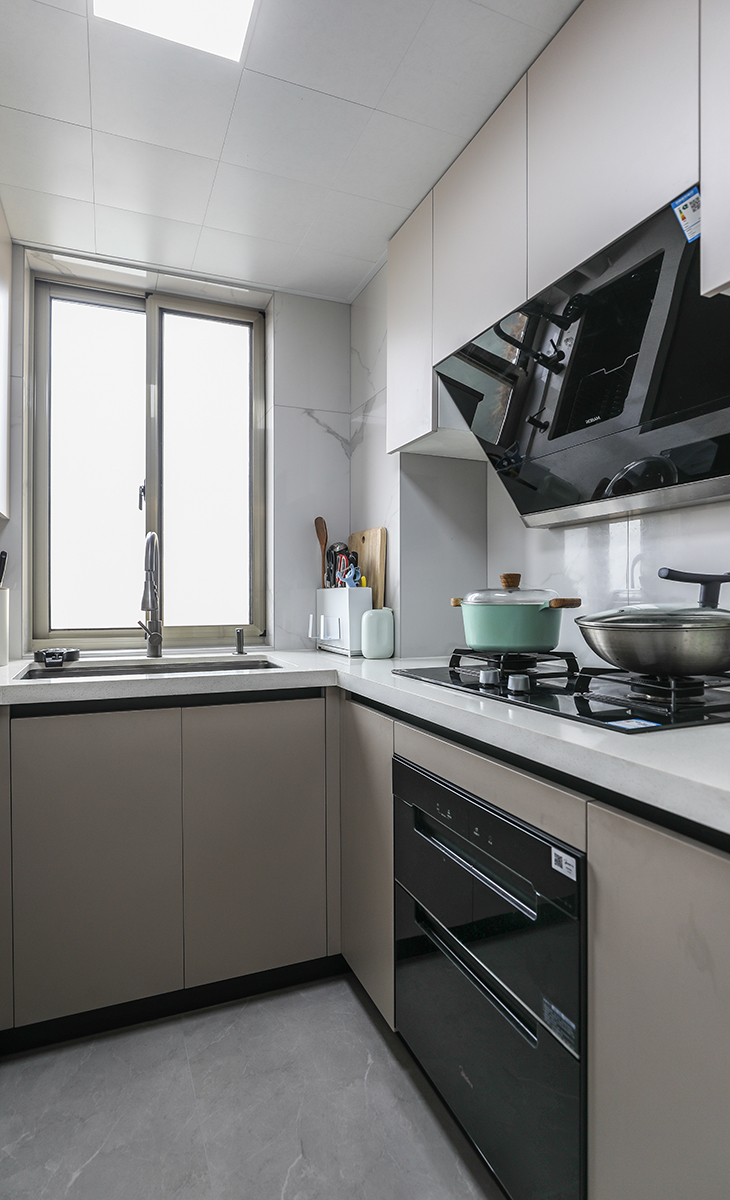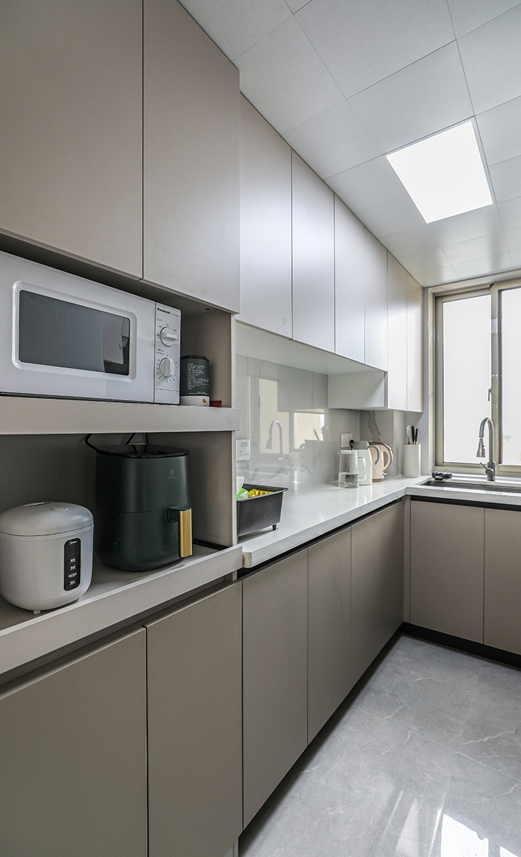 該套房子廚房設計U型櫥柜,增加操作臺面,一邊40cm深淺柜,用來放各種設備,顏色搭配上淺下深,石英石材質臺面更好打理,空間劃分合理,滿足主人制作各種美食的需求,原櫥門拆除,做三聯玻璃移門,整體進出更加方便,空間顯明亮。
