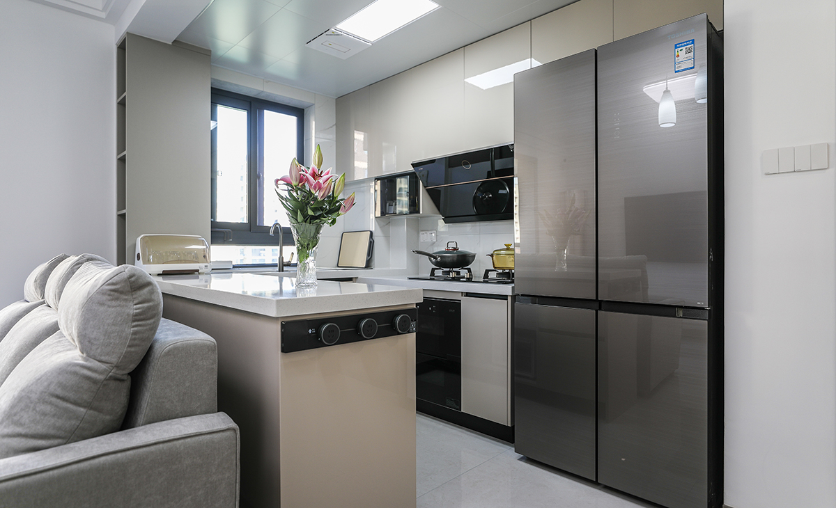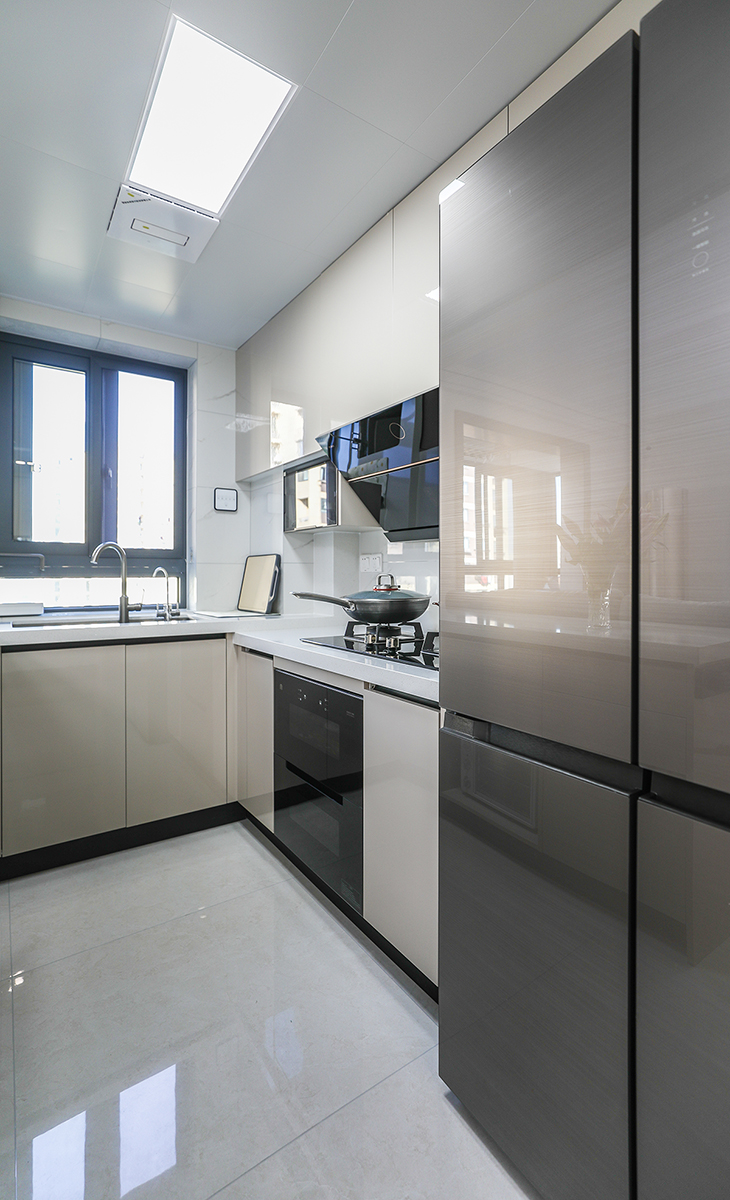 該套房子廚房空間很大,U型兩面櫥柜,另外冰箱邊上也有操作臺,顏色簡潔明快,材質要干凈和好打理,白色的吊頂和米色的櫥柜相呼應,石英石臺面經久耐用,各種廚房電器全部配齊,滿足主人制作各種美食的需求。