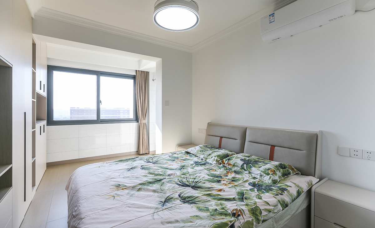 次臥是二間打通并成一個房間,靠近窗臺放了一張床,色彩上以淺色為主,頂面采用石膏線走一圈,使空間比較簡潔明快!