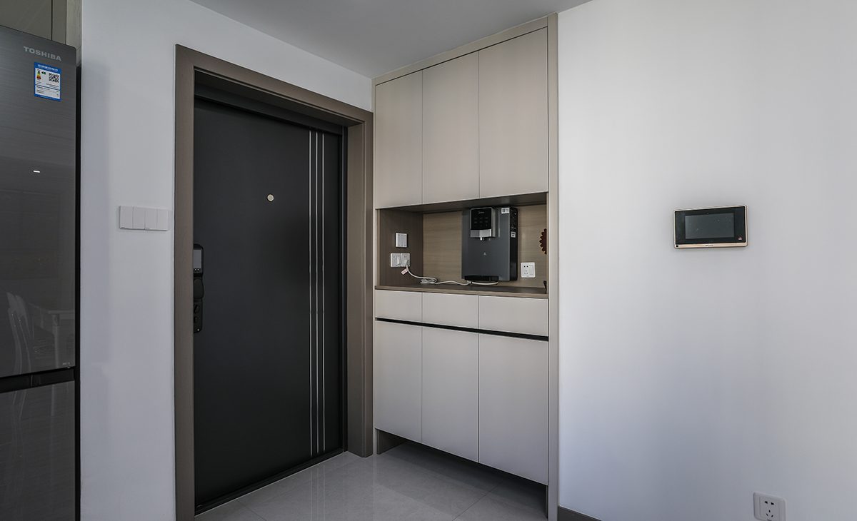 本套房子的走道儲物柜設計也是一大亮點,既實用,又有裝飾性,做玻璃門板,加燈帶設計,展示主人收藏的藝術品,和臥室門顏色相統一,給人感覺不僅雅致而且有韻味。