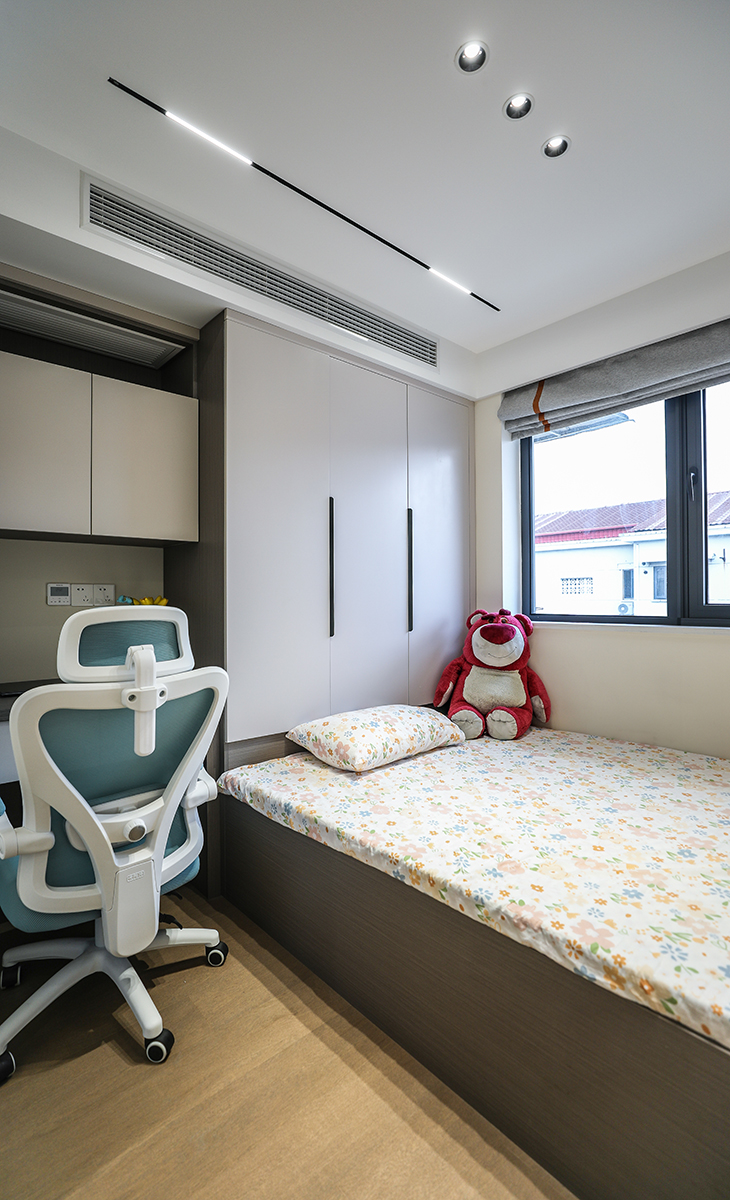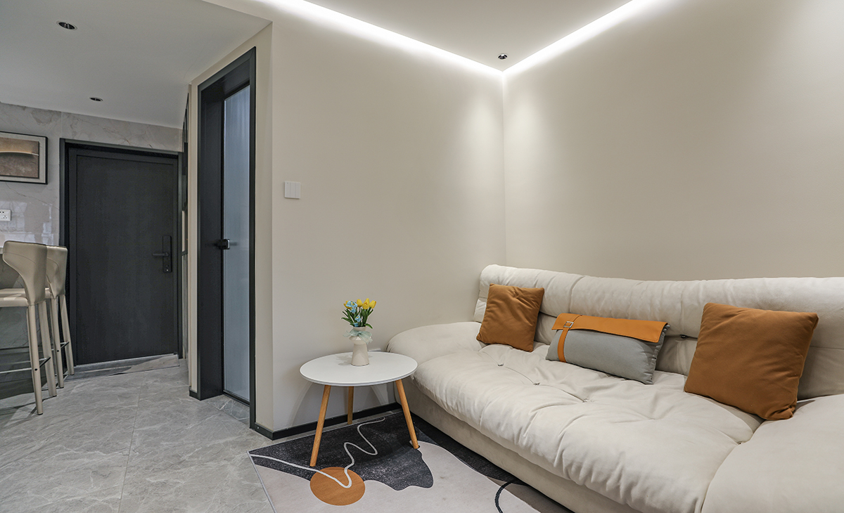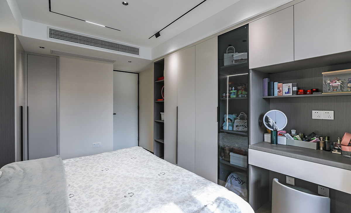 空間整體以米灰色調為主,現代感軟裝與整體空間色調融為一體,三聯動移門更為客廳增加了光亮。