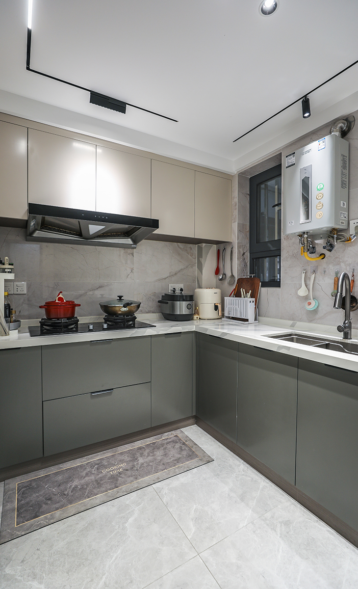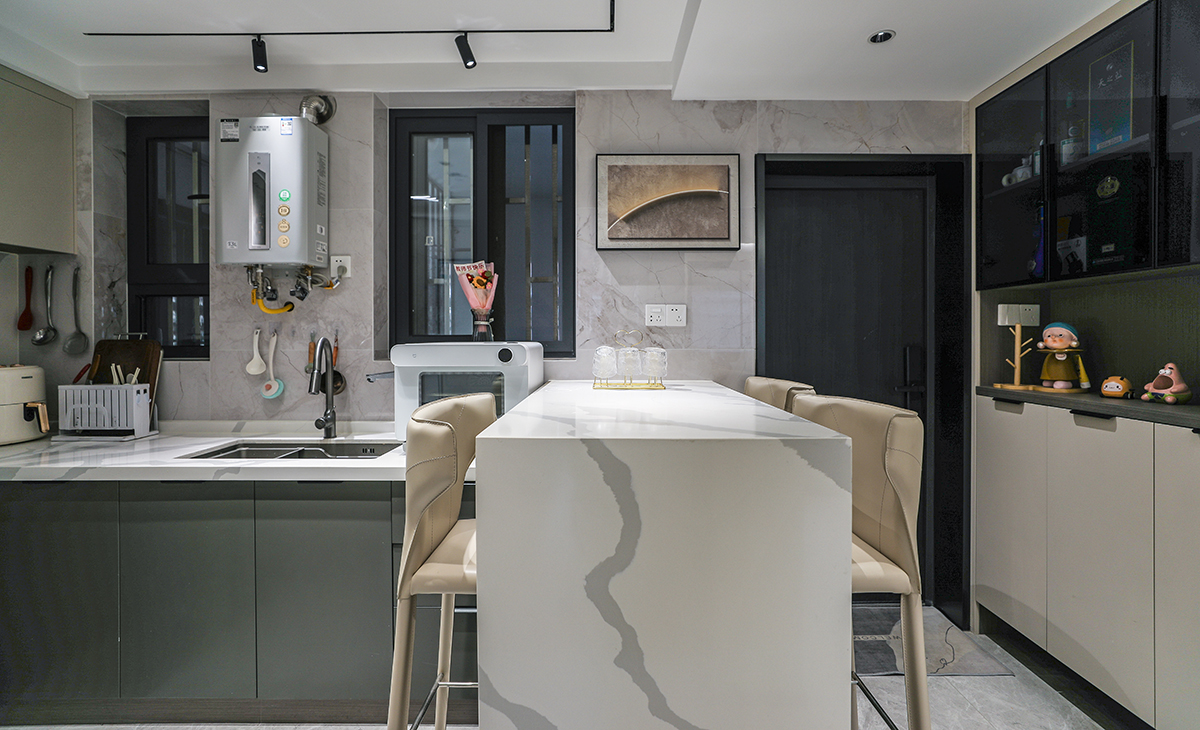 廚房U字型廚柜加島臺設計,滿足了取、洗、切、炒、擺的操作流程。使小小的廚房的收納空間也大大提升。