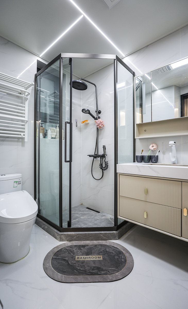 衛生間里容易積聚潮氣,所以通風特別關鍵。鉆石形淋浴房靠窗擺放,兩側分別放置馬桶、臺盆。小衛生間要把活動空間集中在一起,讓動線變的更流暢。