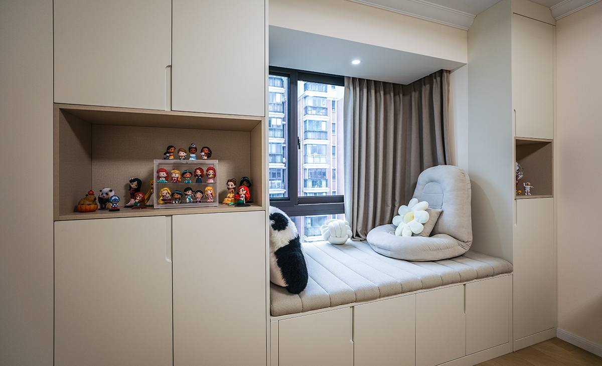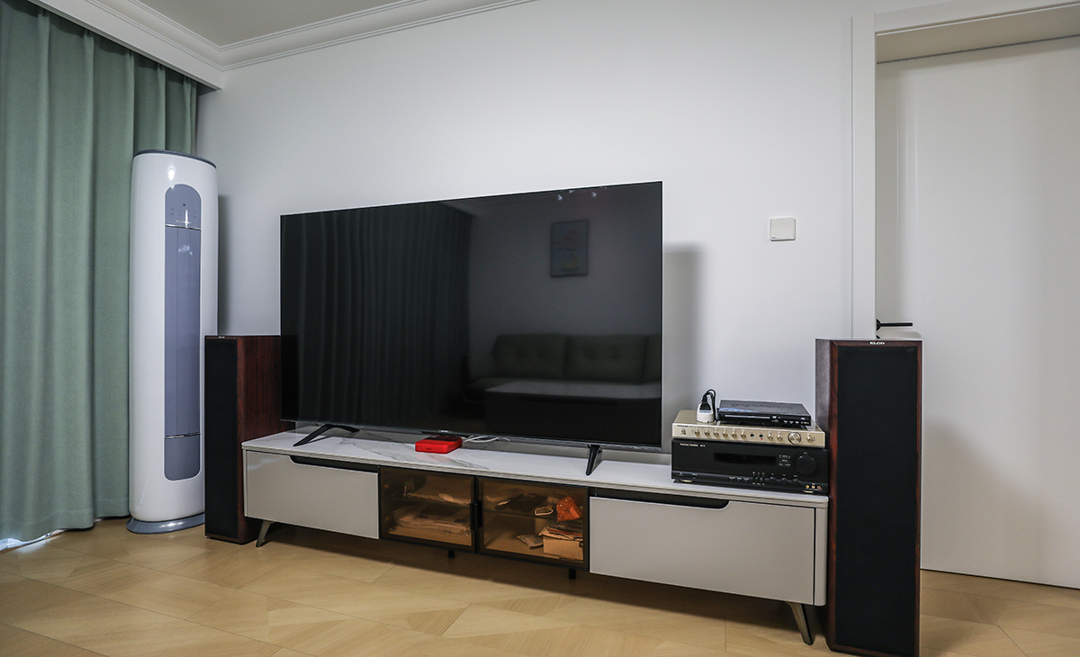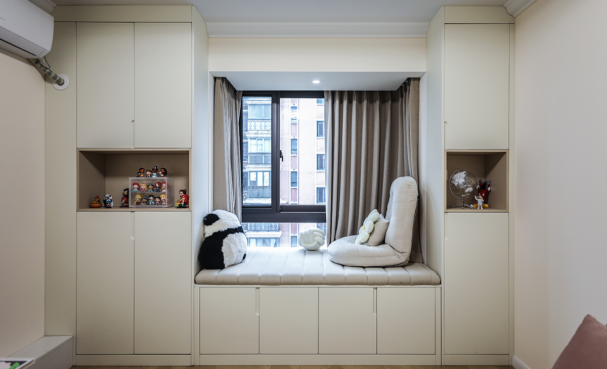 沙發(fā)背景留白設(shè)計,色調(diào)上沙發(fā)和窗簾用淺色,整體淺色為主,既溫馨又簡潔。