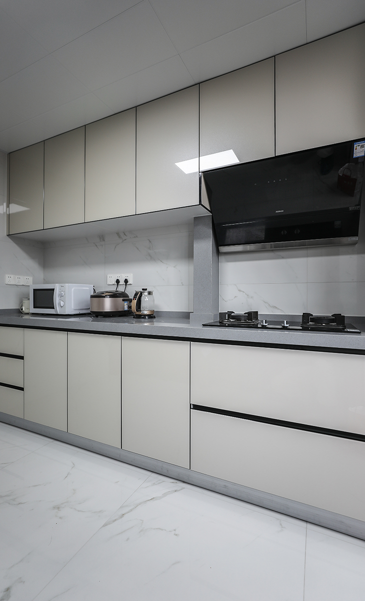 該套房子廚房空間很大,L型兩面櫥柜,另外冰箱邊上也有操作臺,顏色簡潔明快,材質(zhì)要干凈和好打理,白色的吊頂和米色的櫥柜相呼應(yīng),各種廚房電器全部。
