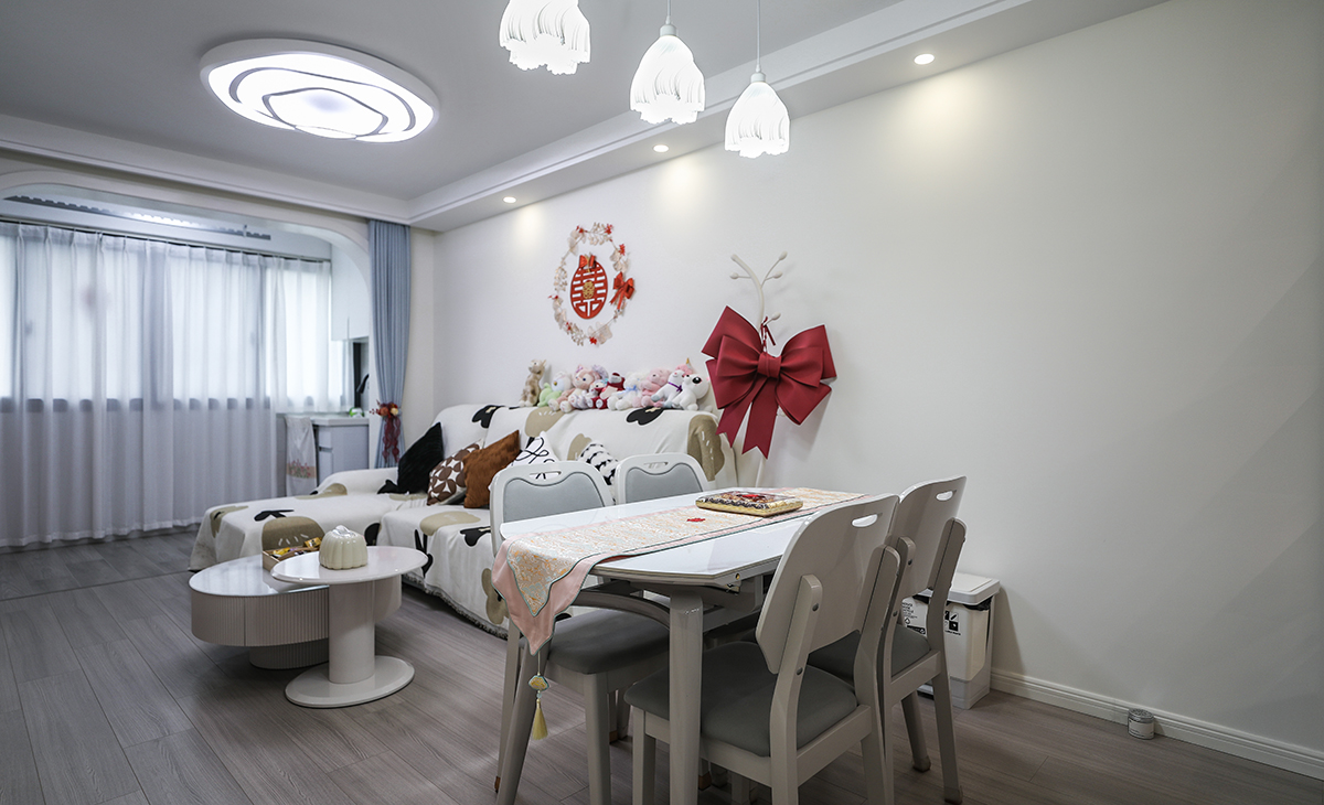 該居室是作為婚房居住,男女主人都是公司白領(lǐng),父母已退休,在該小區(qū)周圍另有住處,平時(shí)居家兩人,所以該套房子裝修體現(xiàn)簡潔、干凈,體現(xiàn)簡約風(fēng)格的舒適之美。講究功能第一,花里胡哨的裝飾物可以拋開不要。該套是二室一廳一衛(wèi),主臥主人住,次臥備用1間。整體墻面做乳膠漆調(diào)色暖白,電視背景墻放電視及隱藏式電動(dòng)投影幕布,可以享受家庭影院般的體驗(yàn),餐桌邊放餐邊柜,增加收納空間,男主人喜歡的手辦也可放玻璃柜展示,營造了一種大氣清爽、簡約而不簡單的氛圍,凸現(xiàn)了主人干凈清爽的性格。