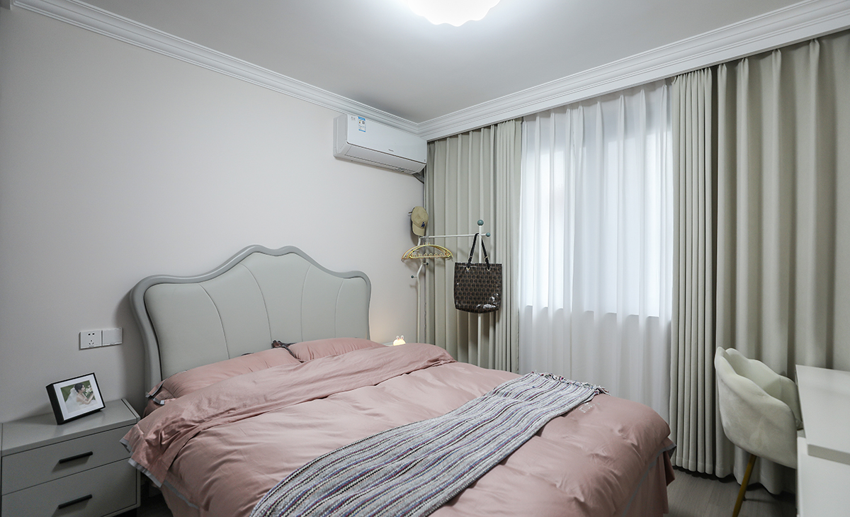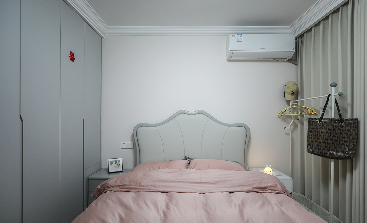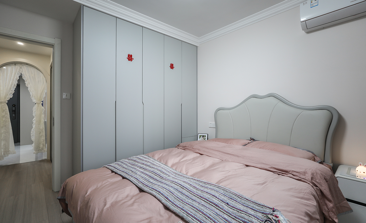 主臥做了到頂?shù)囊鹿瘢黾觾?chǔ)藏,既美觀又實(shí)用,顏色上深淺搭配地錯(cuò)落有致,淺灰木色地板,墻面暖白色干凈清爽,頂面白色乳膠漆,輕巧時(shí)尚的吸頂燈,空間很溫馨和諧。