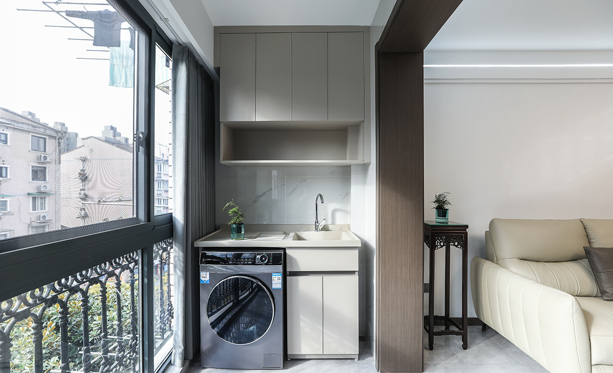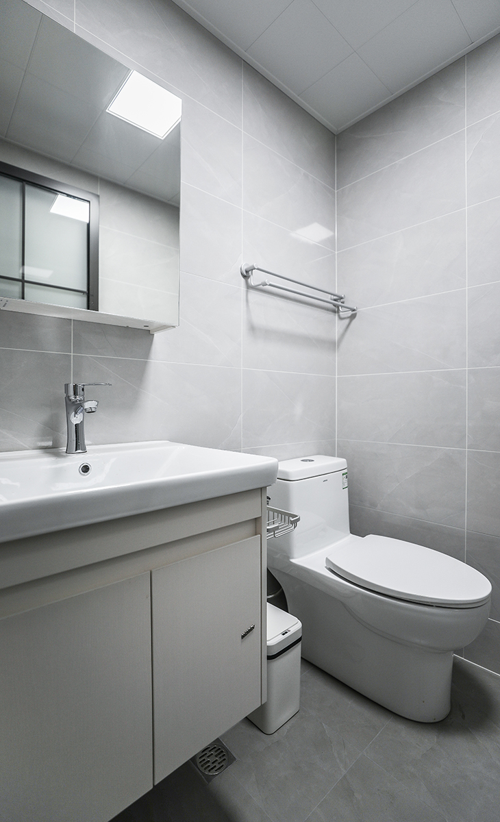 衛生間干濕分離,干區放置90公分洗臉盆,簡潔實用。