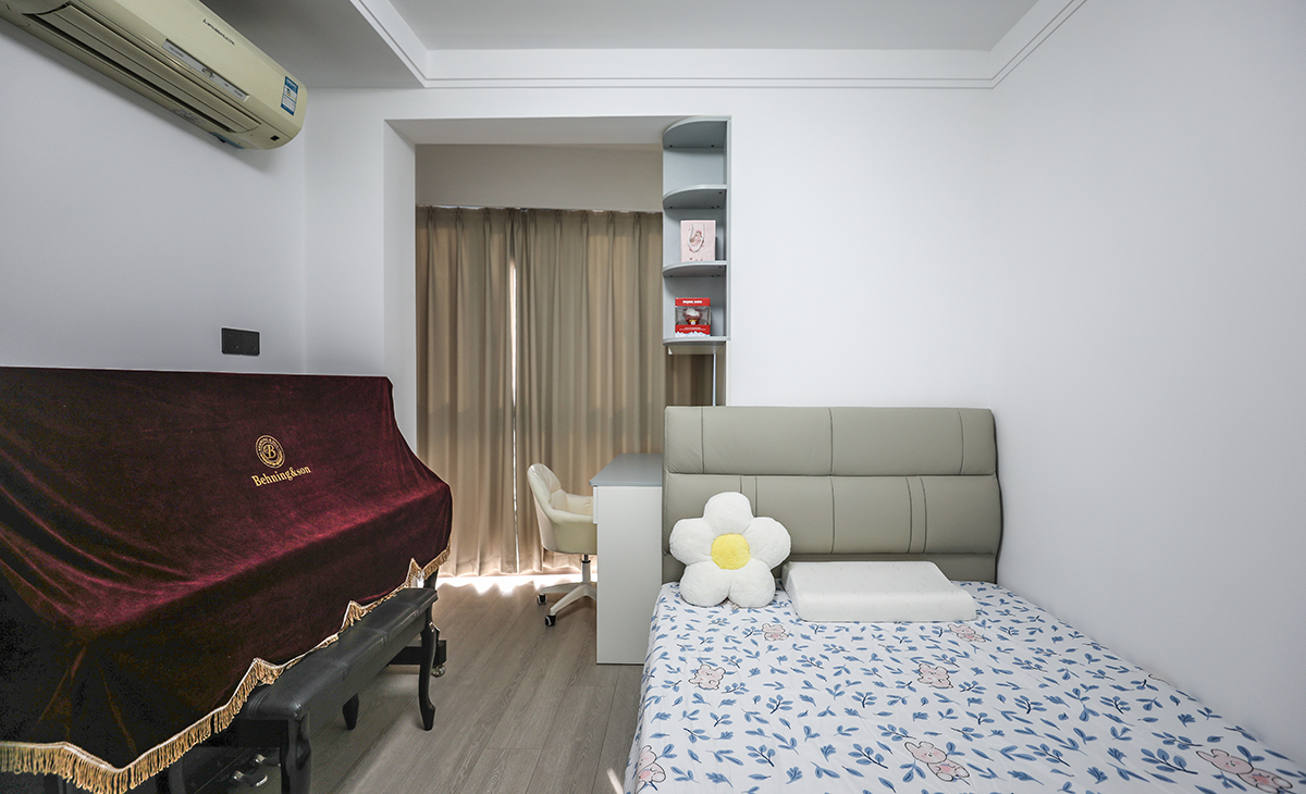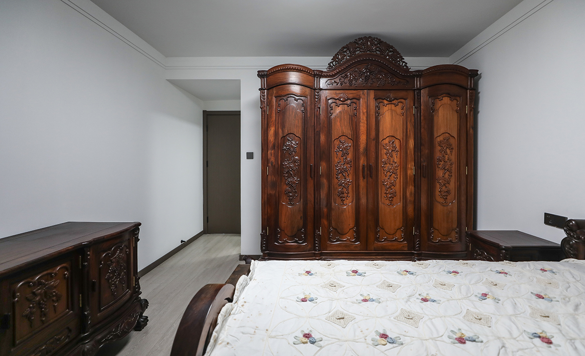 次臥室不做多余的修飾,白墻搭配深色實木家具,厚重富有底蘊。