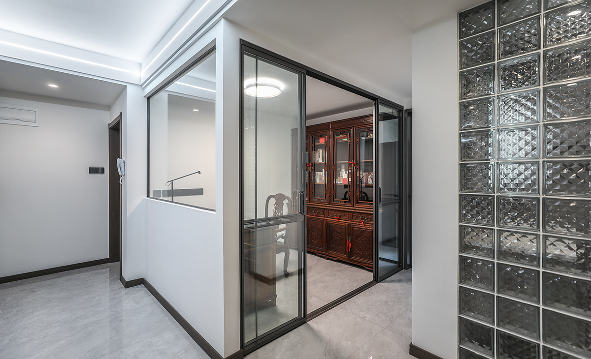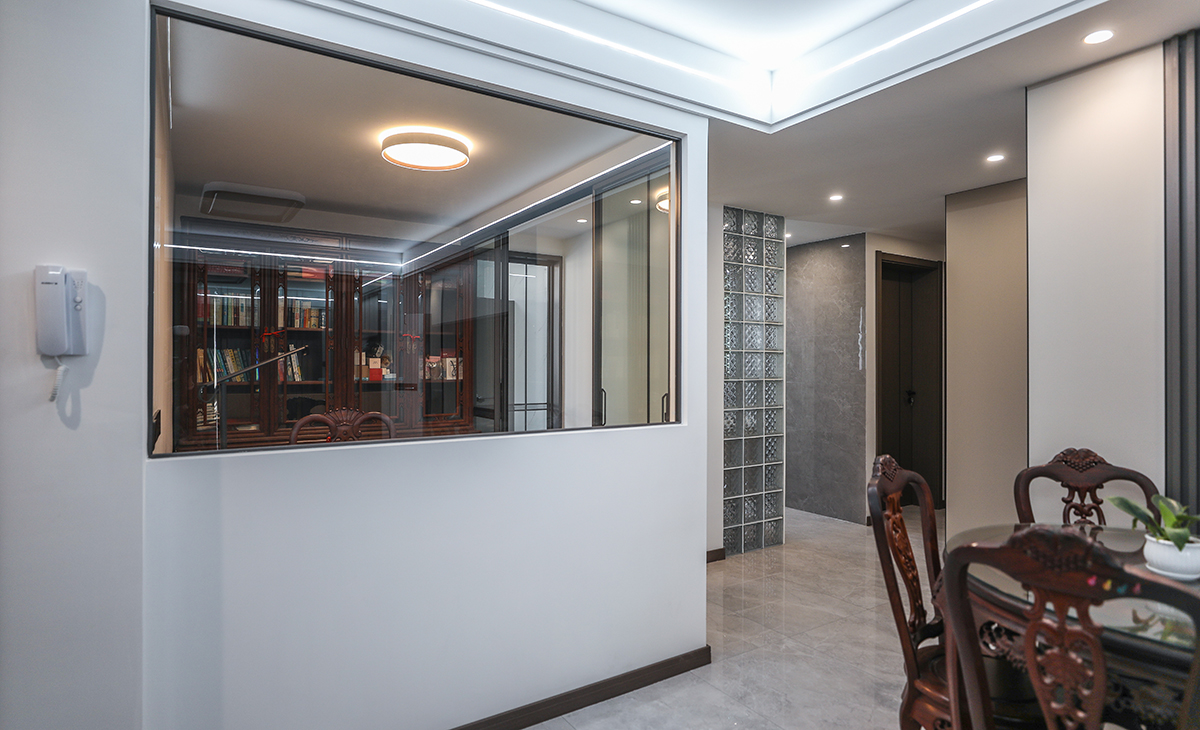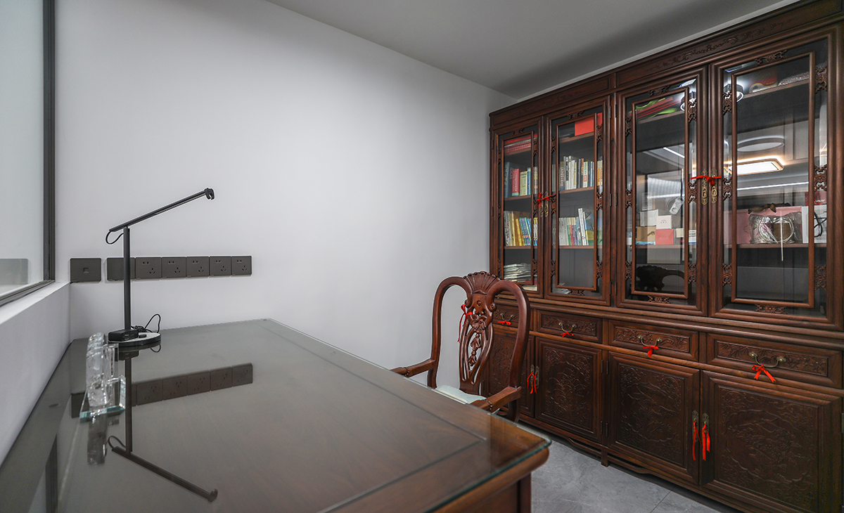 一對年輕帶著一個女兒居住和自己的父母一起居住,男主人是平時工作比較忙經常出差,女主人也是事業型的,基本晚上回來很晚上經常在家辦公,所以需要一間獨立的書房,因此我把原先餐廳的位置改成了書房,因為小夫妻平時比較忙,通常只是外公外婆帶小孫女在家,對餐廳的空間需求不大,有餐廳功能即可,因為居住的人員較多儲物空間需求較多,因此做了很多儲物柜,除了兒童房兩間大人房保留紅木家具,客廳做了整體電視柜,整體色調偏向深色和質感強烈的紅木家具相協調,整體呈現簡潔大氣的感覺。