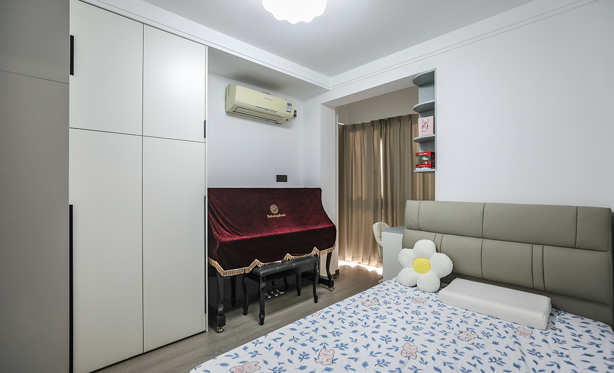 原木色地板,紅木衣柜,造型以簡潔平板為主,方便打理,體現了簡約風格的簡潔、隨意,不拘一格。