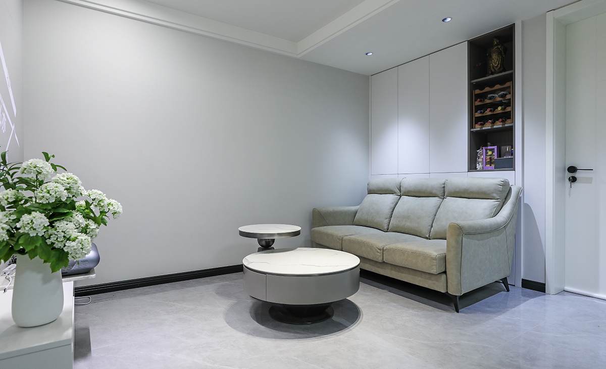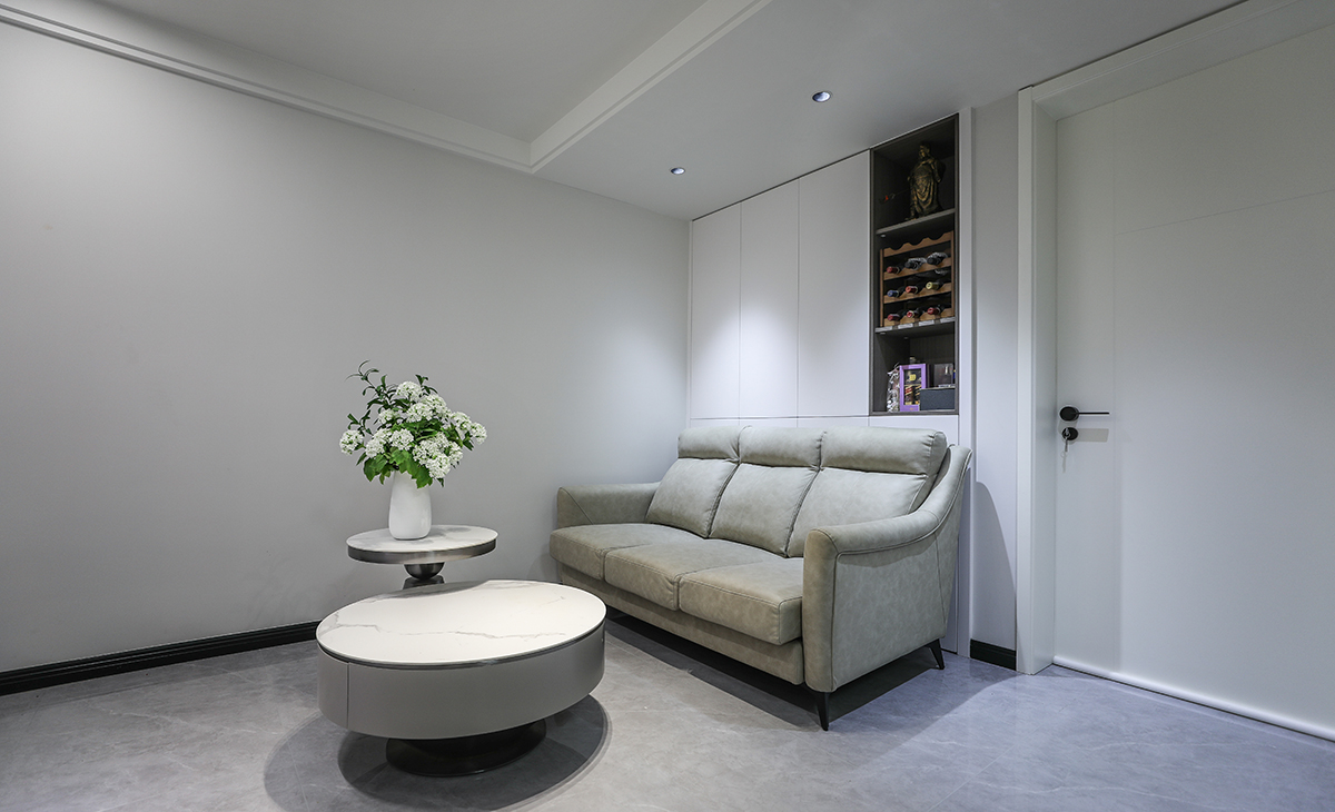 沙發背景上吊嵌入式壁柜,白色的門板配備深灰色開放隔顏色相輔相成,因客戶家為一樓光線較暗,色調上墻面涂料全部采用白色乳膠漆,沙發用淺灰色,深淺搭配的錯落有致,既溫馨又簡潔。