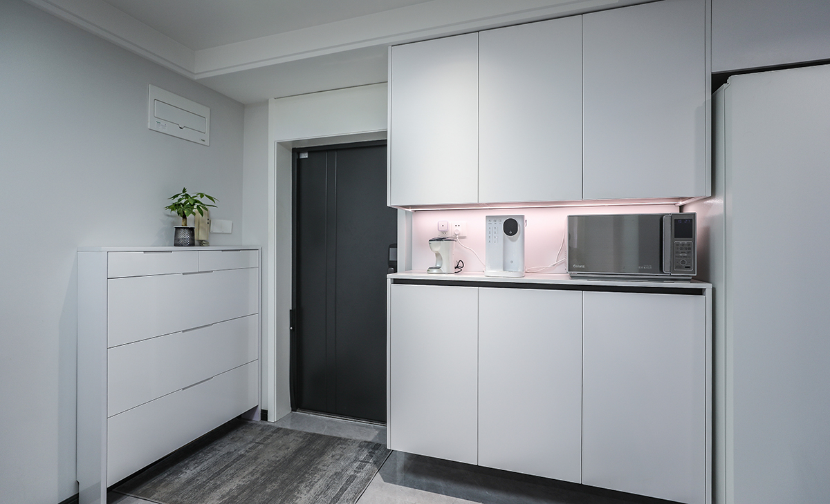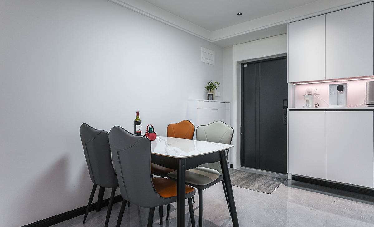 餐廳空間比較方正寬敞,靠入戶門做一排餐邊柜兼鞋柜,既實用、又有裝飾功能,白色框架板及白色門板配黑色踢腳線顏色相互襯托,巖板餐桌把用餐氛圍調和的很溫暖,淺灰色地磚很干凈,色彩和造型上都簡潔大氣。