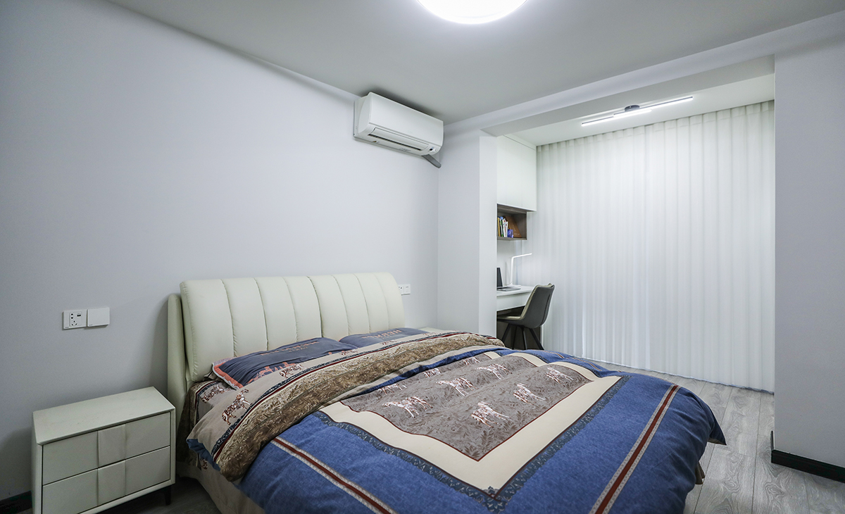 主臥配有淺灰色地板,所以床選擇的是米色牛皮質感,衣柜門板也是白色,這樣和地板黑白灰色調相搭配,一點不突兀,頂面圓型吊扇燈,實現方中有圓,圓中有方,造型以簡潔平板為主,方便打理,體現了簡約風格的簡潔、隨意,不拘一格。