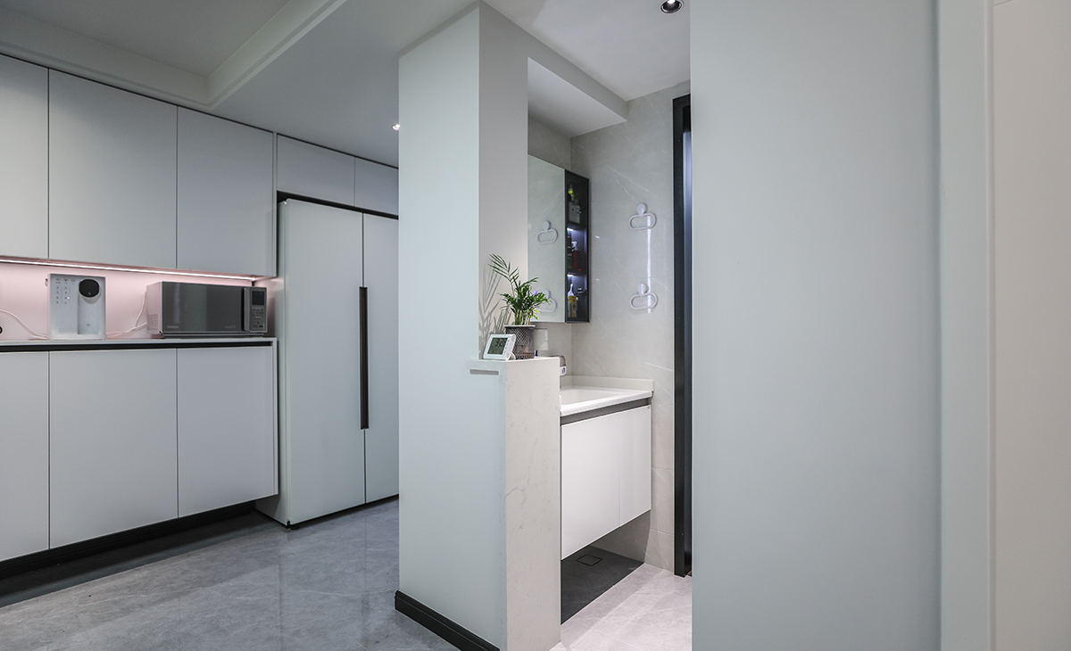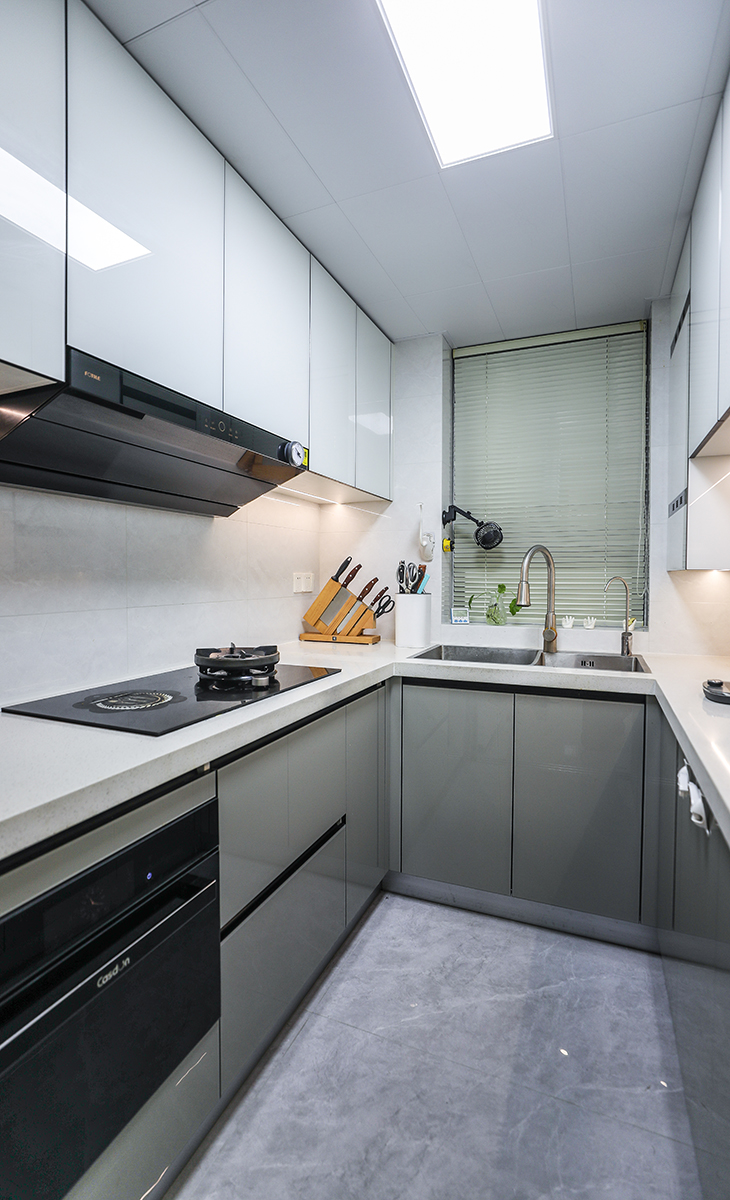 該套房子廚房空間很大,U型三面櫥柜,極大的滿足了客戶的操作需求,顏色簡潔明快,材質要干凈和好打理,白色的吊頂和米色的櫥柜相呼應,石英石臺面經久耐用,各種廚房電器全部配齊,滿足主人制作各種美食的需求。