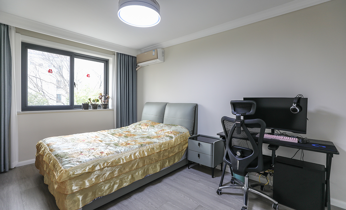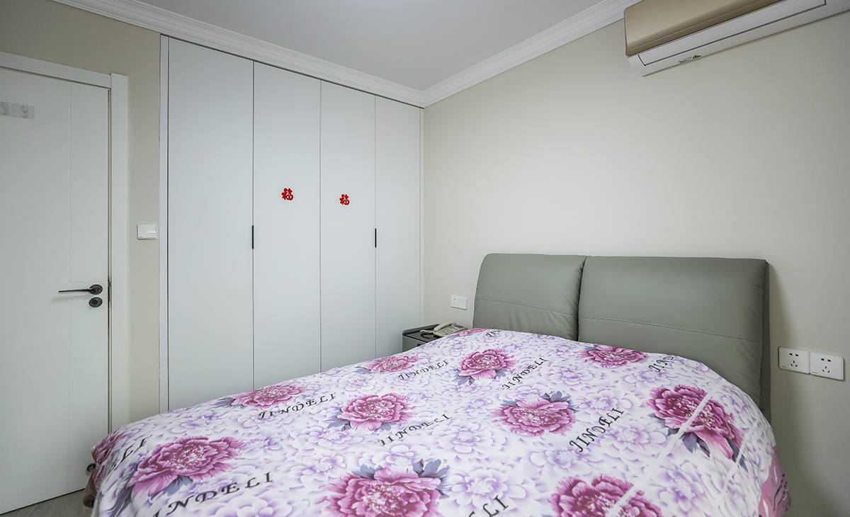 次臥整體簡單為主,皮質的床搭配灰色的地板,頂面白色乳膠漆,既簡單又實用。