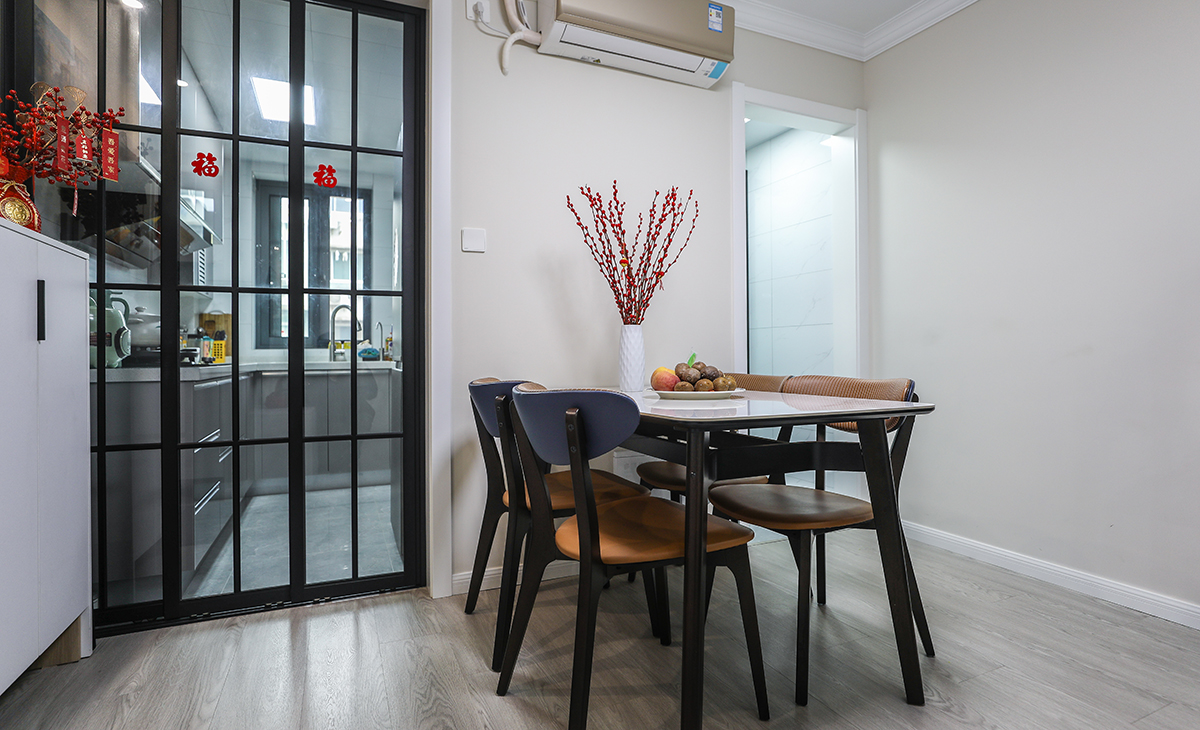 餐廳空間比較方正,但空間感略顯局促,靠墻做一排半高鞋柜,既實用、又有裝飾功能,通體白色鞋柜與淺色墻面相呼應,巖板餐桌把用餐氛圍調和的很溫暖,淺灰色地板很干凈,色彩和造型上都簡潔大氣。