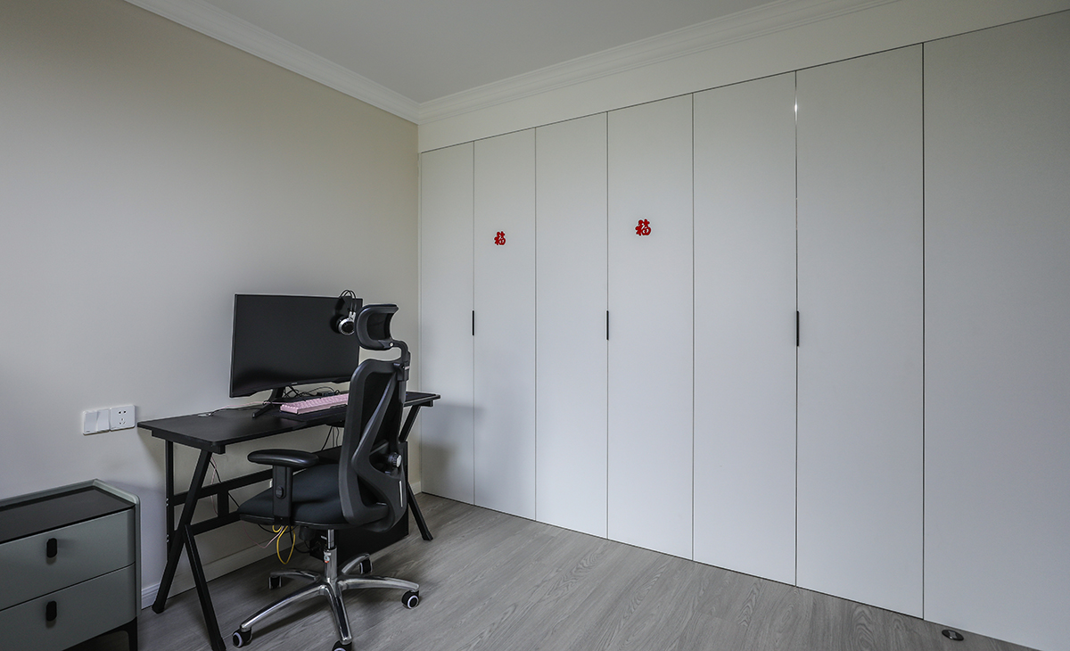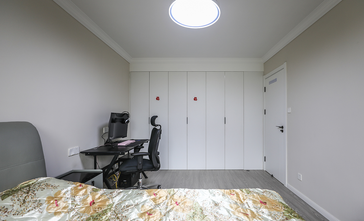 主臥地板亦采用了灰色,因為整體簡約為主,所以個別材質會特別豐富,比如衣柜門板乳白色為主,和淺灰色地板進行搭配,床又以皮質材質為主,既有層次又不突兀,頂面圓型吊扇燈,實現方中有圓,圓中有方,造型以簡潔平板為主,方便