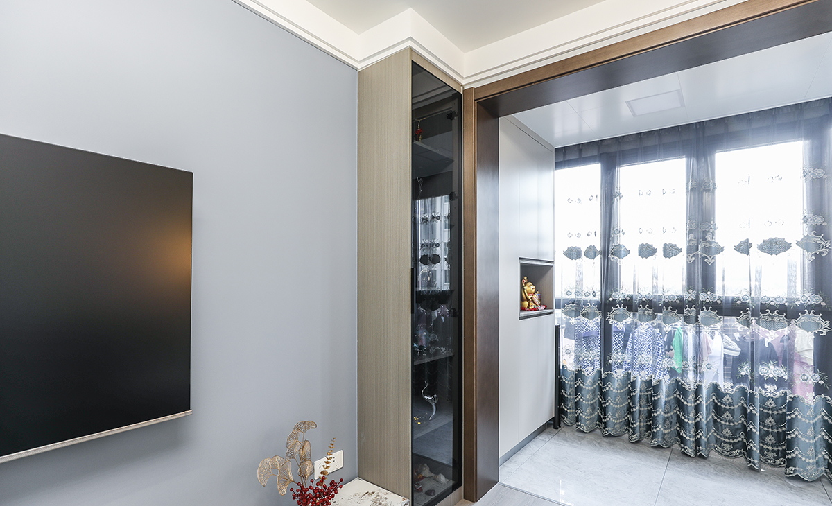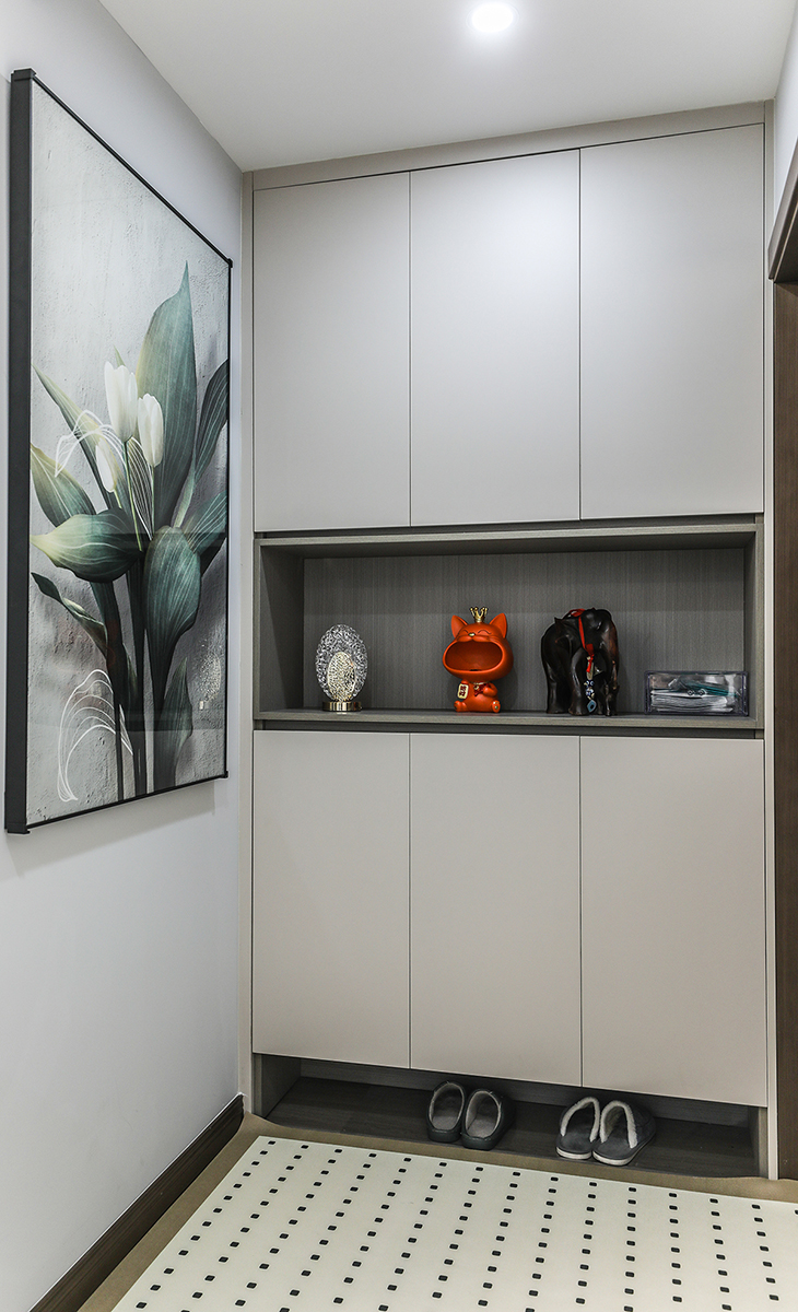 關(guān)柜功能上在接待客人、換衣、換鞋和放包的功能等,還具有延伸空間的效果。此外,它也可以打造成小平臺(tái),放置小物品如鑰匙,從而增加居家裝飾的趣味性。裝飾物和紅色玩偶放在柜子的中空處,這種布局方式不僅突出了紅色元素,還增加了空間的藝術(shù)感和層次感,同時(shí)進(jìn)門之后是一堵墻,墻面上放置一幅裝飾畫,顏色漂亮獨(dú)特。而且。特別在家人或朋友來(lái)訪時(shí),能有效解決視覺(jué)干擾和心理安全問(wèn)題,使出入過(guò)程更加有序。