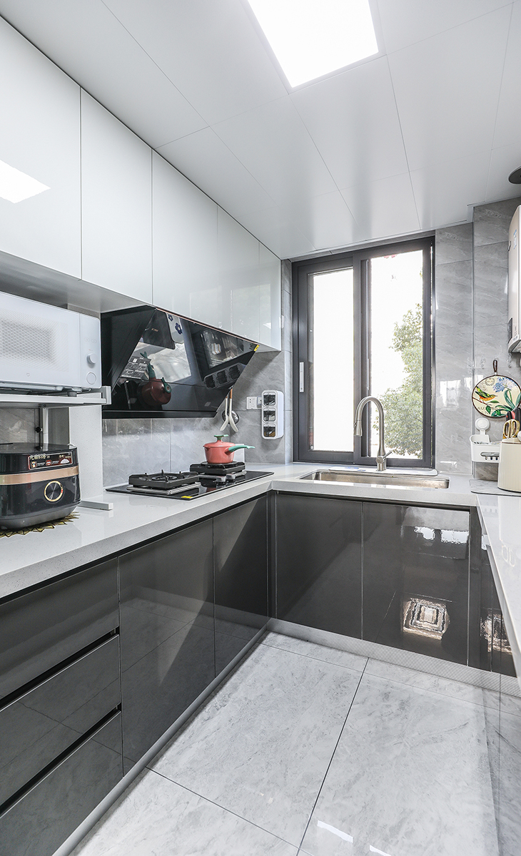 此廚房室U型設(shè)計(jì),水槽、切菜,烹飪、等都沿著一條直線或直角排列,這樣的布局既方便了操作,也節(jié)省了空間。色調(diào)以黑白為主,線條簡(jiǎn)潔,沒(méi)有過(guò)多的裝飾,看起來(lái)非常干凈利落這樣的布局既實(shí)用又美觀。