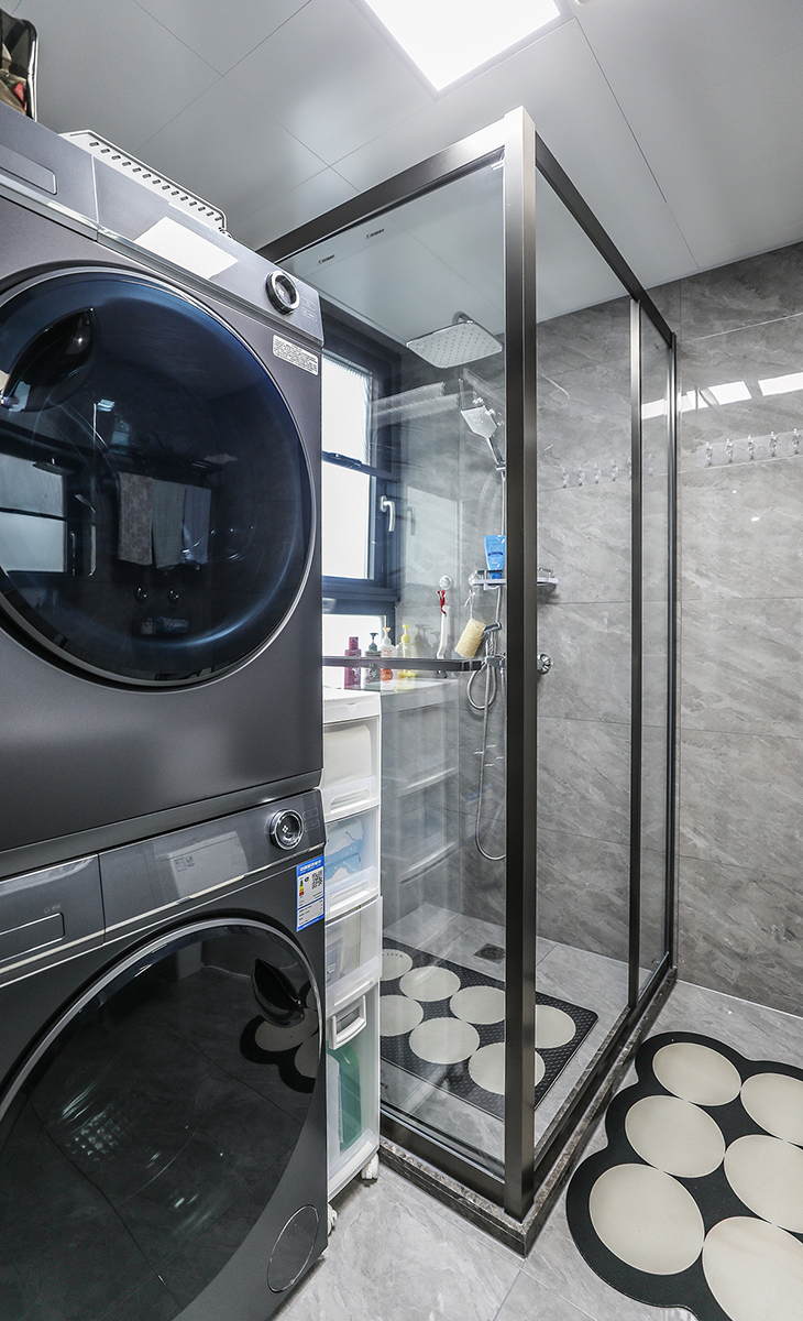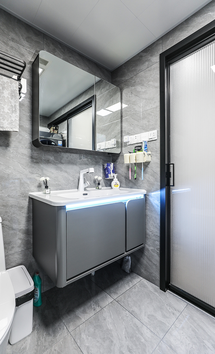 衛(wèi)生間設(shè)計(jì)風(fēng)格簡(jiǎn)約而時(shí)尚,整體色調(diào)以白色和灰色為主,給人一種清新整潔的感覺(jué)。墻磚采用淺灰色,與白色馬桶相得益彰,而洗手臺(tái)上的一條燈帶更加的增強(qiáng)了空間的層次感。