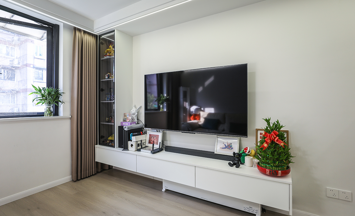 進戶的落塵區(qū)(玄關區(qū))有效的增加了進門放鞋子以及鞋柜對面隱藏式的掛衣區(qū),因為空間結(jié)構問題,掛衣區(qū)旁邊增加一個雜物間,并做隱形門設計。