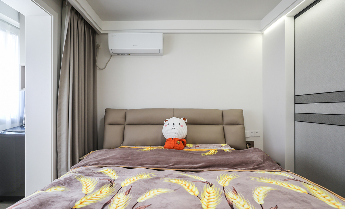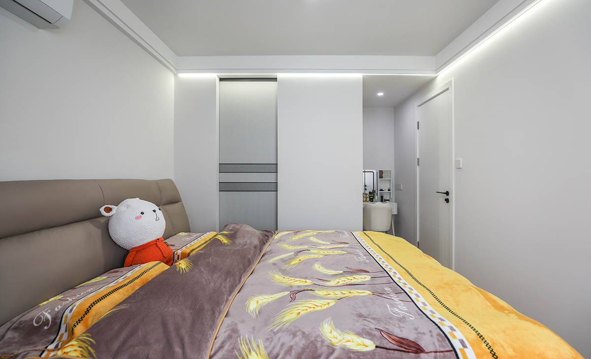 簡約的空間布局,頂面的雙眼皮走邊以及局部線性燈裝飾,做到了見光不見燈的設計效果,臥室增加衣帽間和專屬化妝區(qū),即解決了儲物問題,又讓空間動線變得更加合理。
