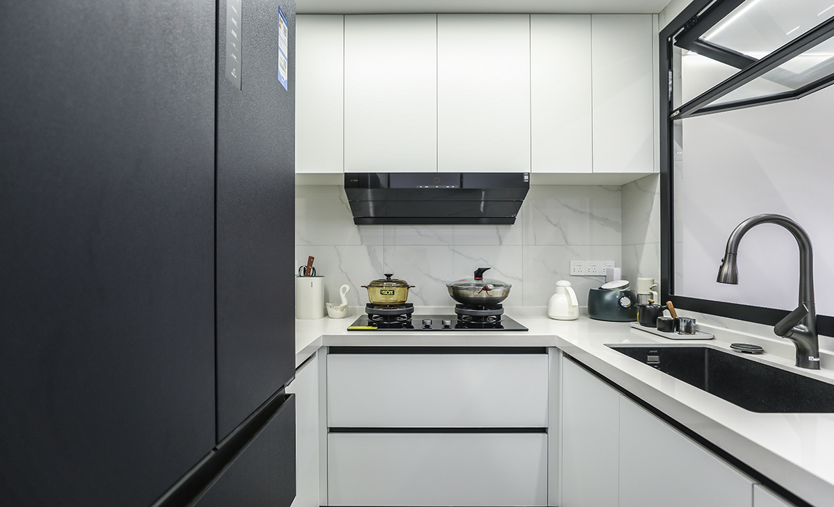 房半開放式設計,滿足了取、洗、切、炒、擺的操作流程。更讓煮飯時和家人有更多的互動空間,同時使小小的廚房的收納空間也大大提升
