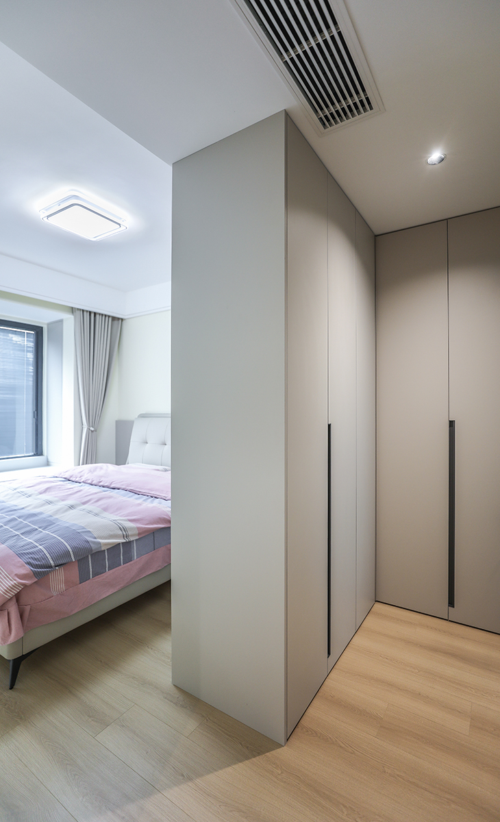 床頭背景與主臥開放式衣帽間整體呼應一體。