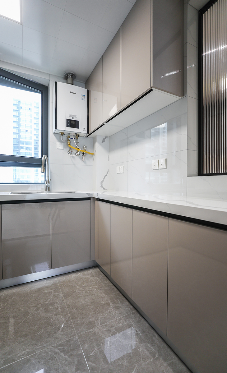 該套房子廚房空間較大,U型三面櫥柜,采用高光pet門板,顏色簡潔明快,材質干凈和好打理,白色的吊頂和米色的上、下櫥柜相呼應,石英石臺面干凈、好打理,各種廚房電器全部配齊,滿足主人制作各種美食的需求。