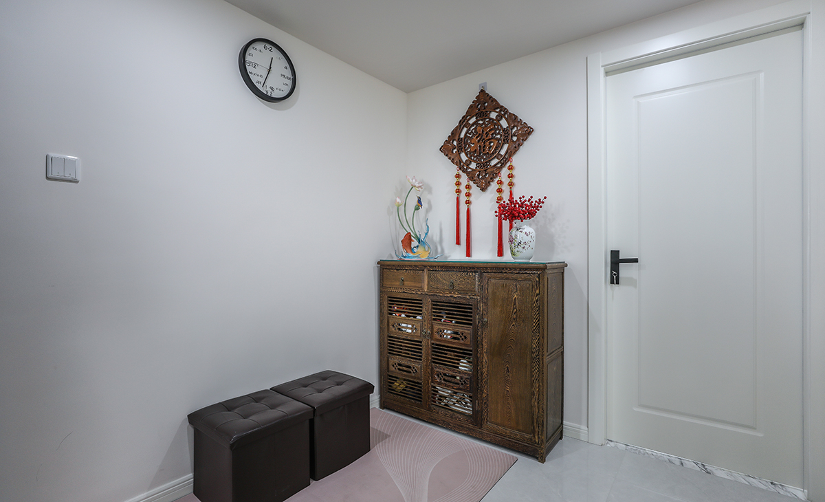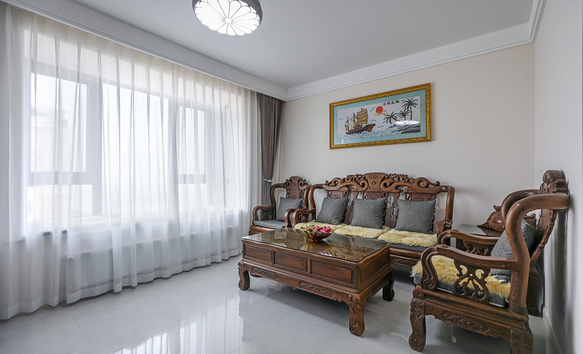 客廳開間很大,客戶家里實木家具是原先保留下來的,雞翅木質感強硬,跟客戶雍容華貴的身份相吻合。客廳空間也很寬闊。吊頂造型上采用雙眼皮吊頂。地面采用淺灰色地磚。造型和色調上無不給人以簡潔、大氣、時尚的感覺。
