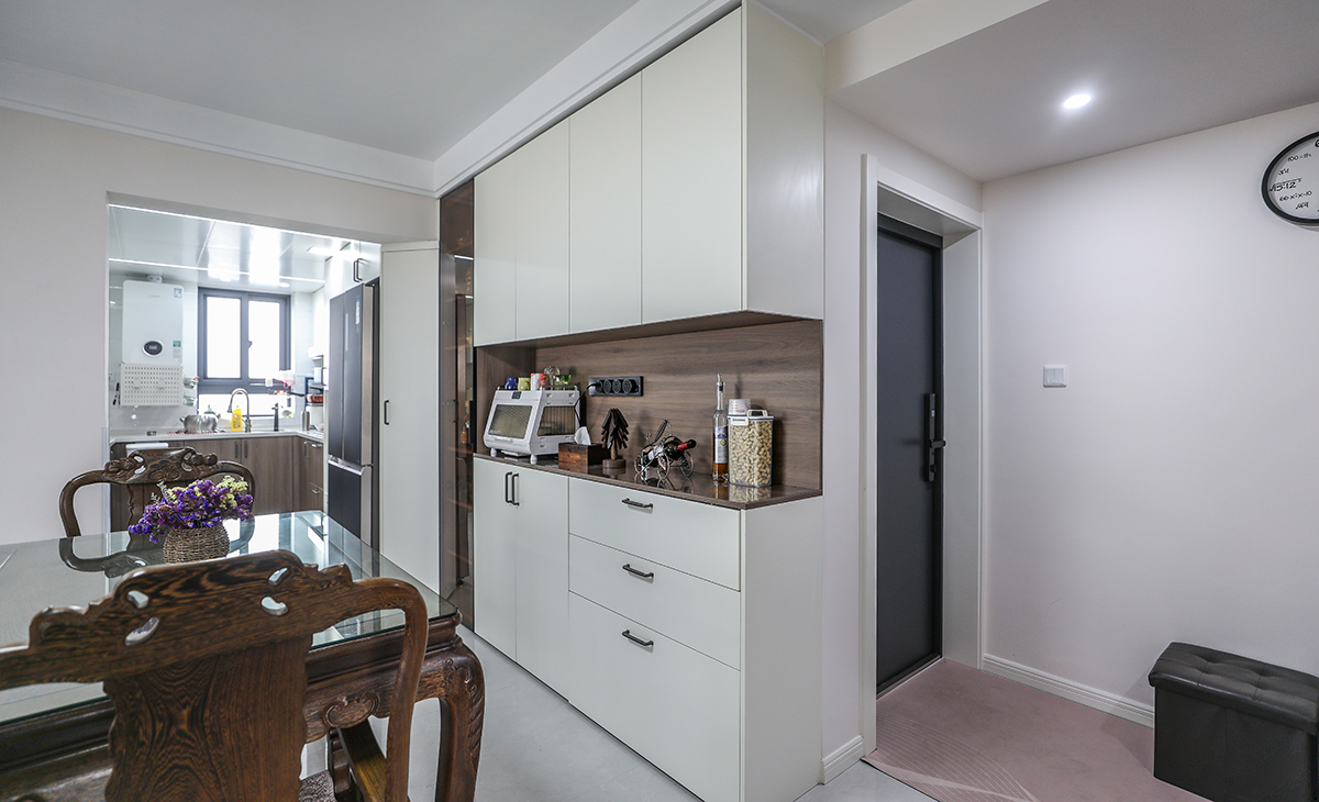餐廳靠墻做一排裝飾柜,既實用、又有裝飾功能,極大的滿足了客戶的儲物多需求。深棕色框架與餐桌椅相呼應,淺灰色地磚很干凈,色彩和造型上都簡潔大氣。