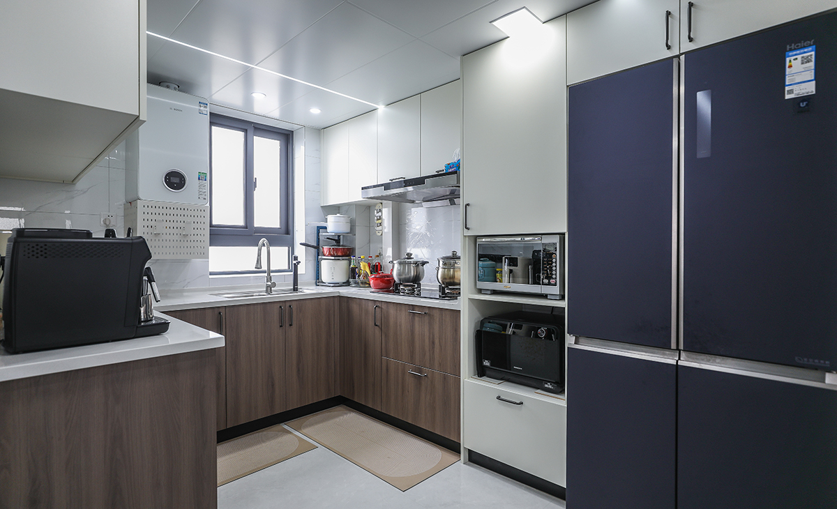 該套房子廚房空間很大,U型三面櫥柜,另外冰箱邊上做了到頂的電器高柜,顏色簡潔明快,材質要干凈和好打理,白色的吊頂和米色的吊柜櫥柜相呼應,石英石臺面經久耐用,各種廚房電器全部配齊,滿足主人制作各種美食的需求。