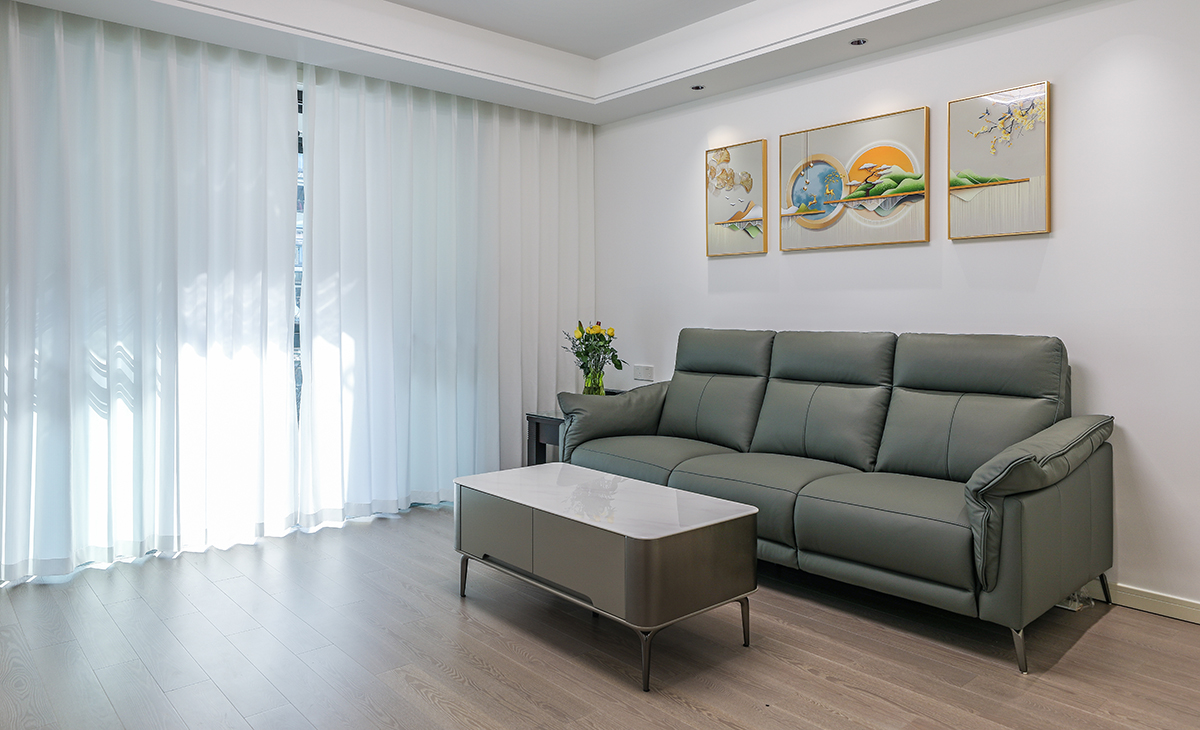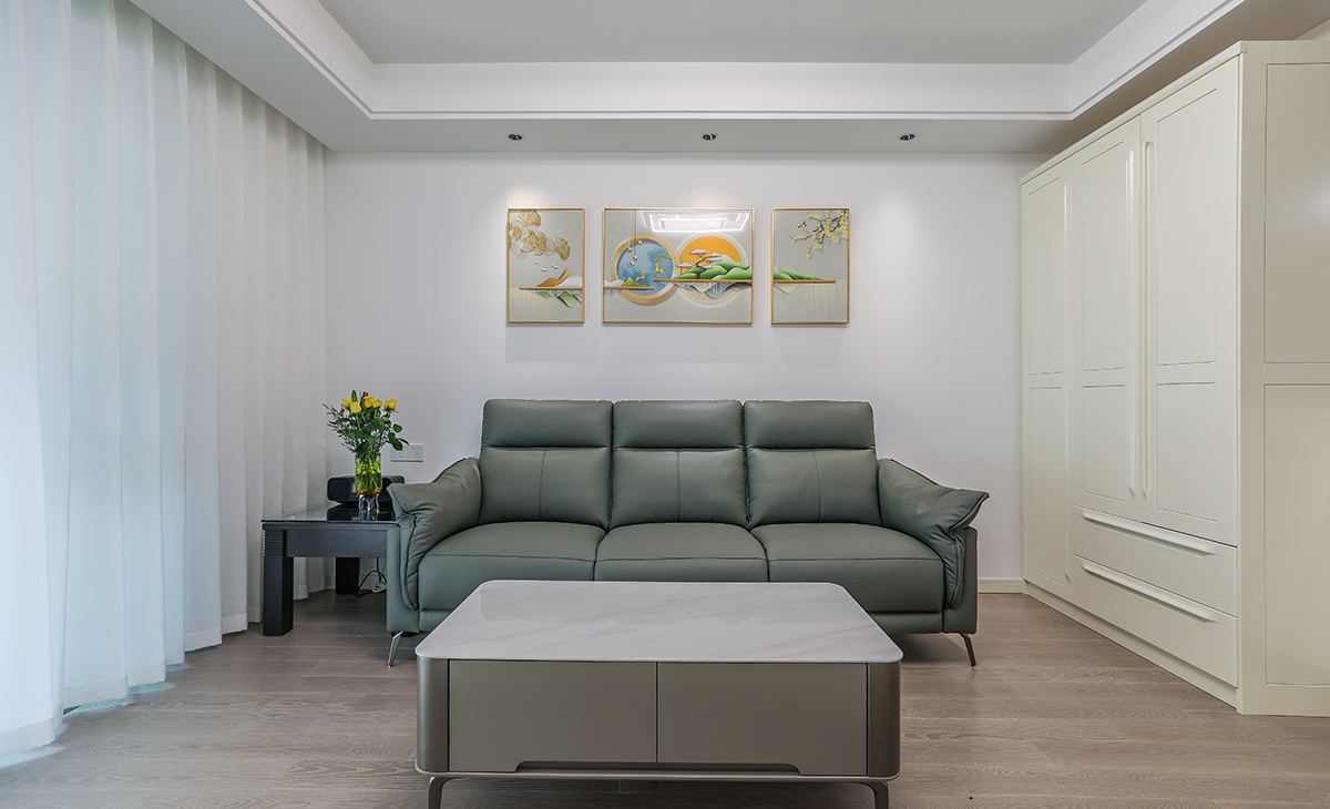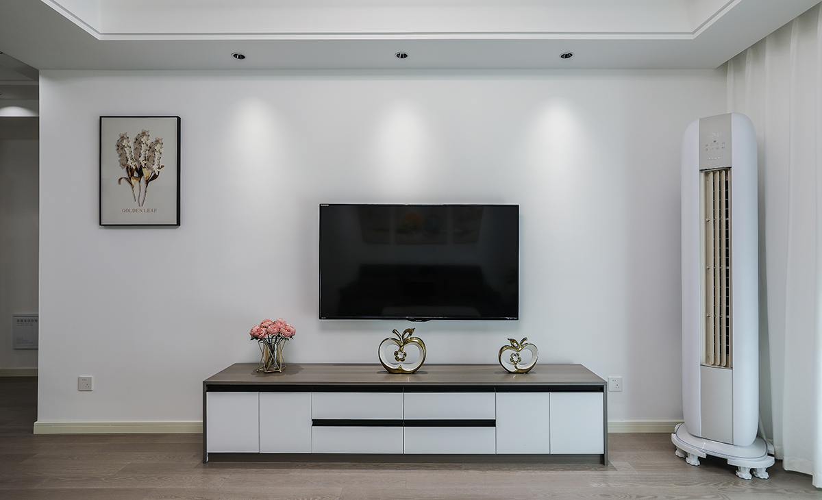 窗簾顏色和沙發相呼應,和白色陽臺門套相配襯,電視柜與茶幾的裝飾,讓空間活躍很多,通長電視柜也很大氣,沙發后搭配的壁畫,讓整個空間呈現一種欣欣向榮的感覺。