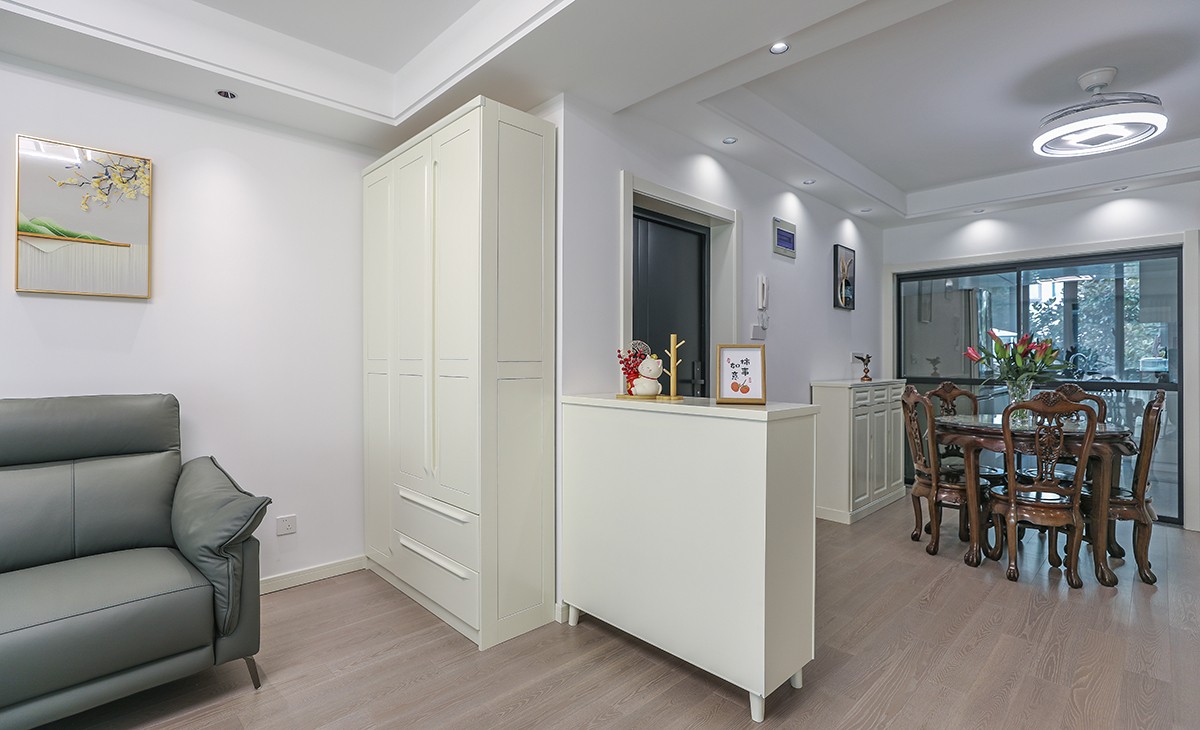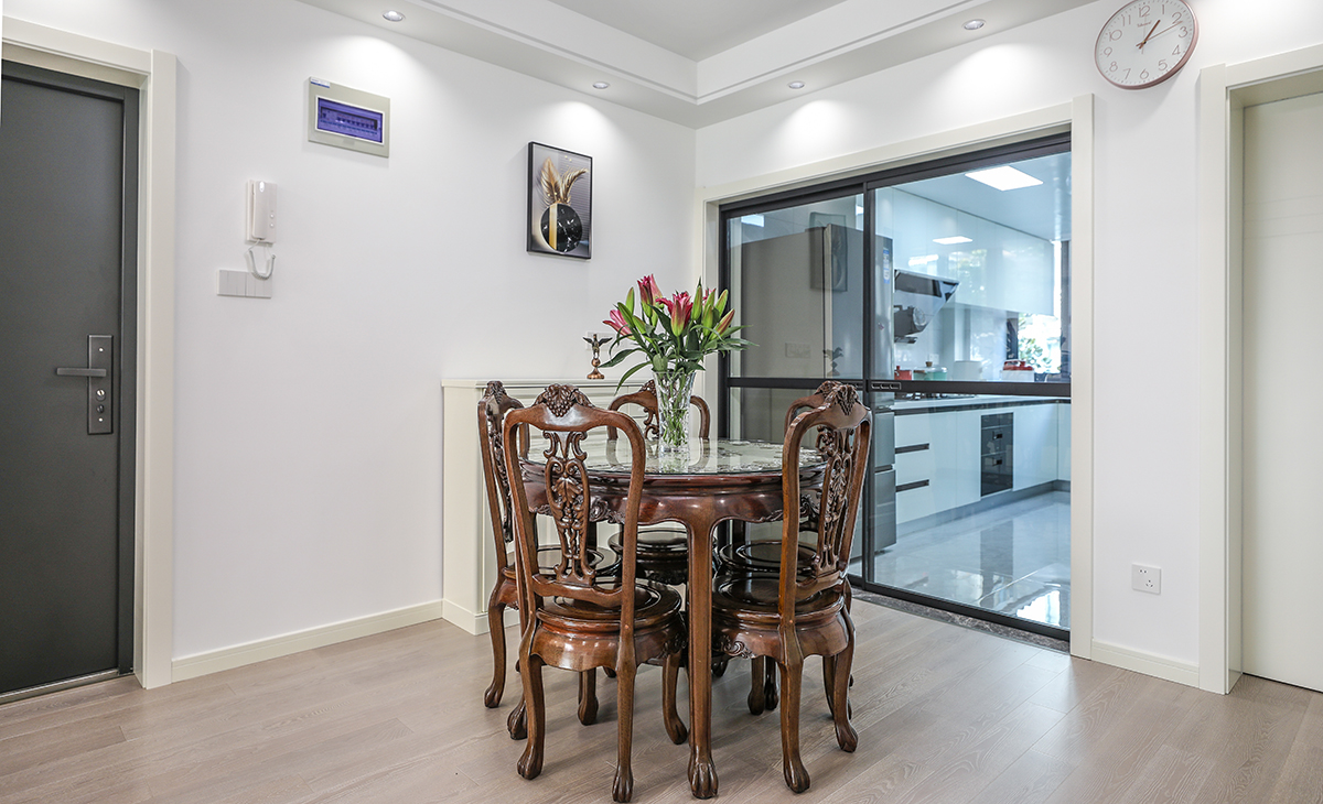 餐廳合理利用,餐桌邊做邊柜保證儲物空間,右手邊玻璃展示高柜放置兒子的手辦。保留的原始圓形的餐桌,平時家里只有2-3個人吃飯,夠主人用搭配上方風扇燈,簡潔實用。