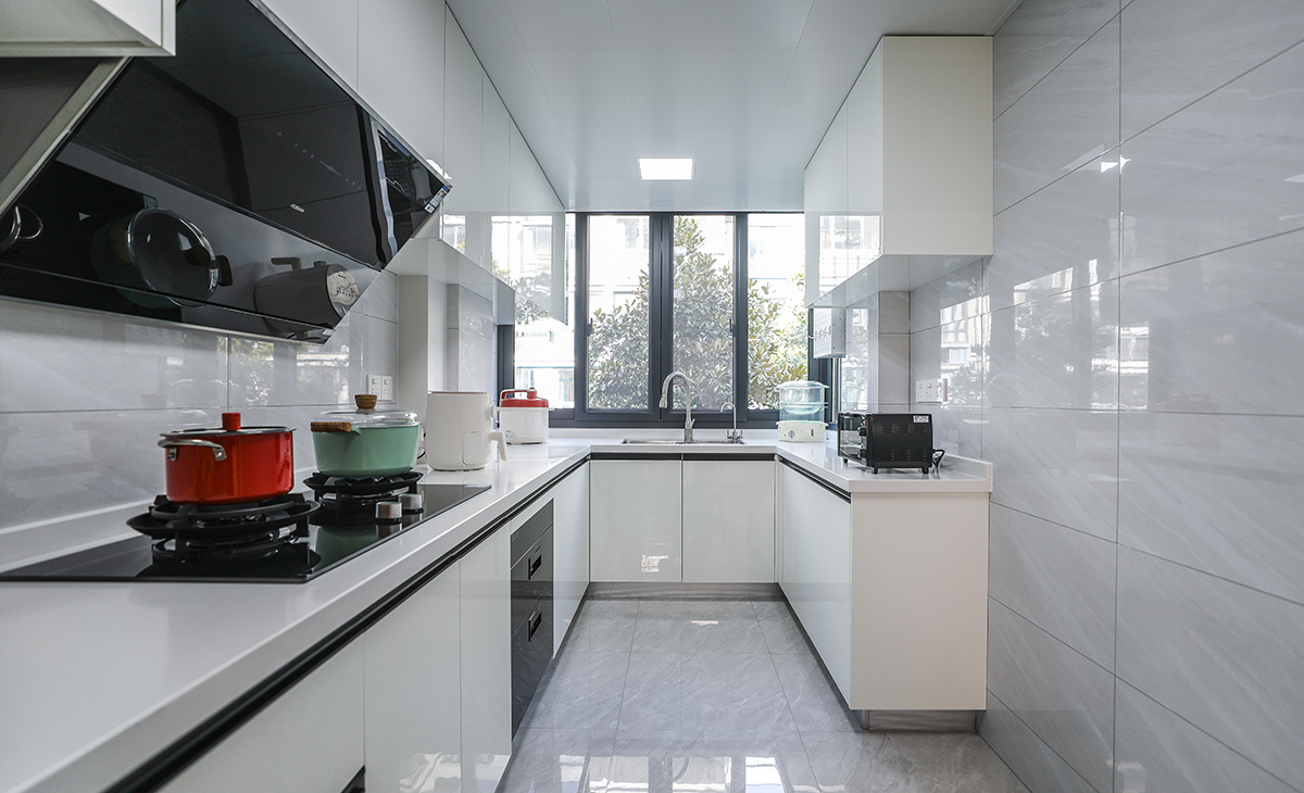 該套房子廚房空間較大,U型三面櫥柜,采用高光pet門板,顏色簡潔明快,材質干凈和好打理,白色的吊頂和白色的上、下櫥柜相呼應,石英石臺面干凈、好打理,各種廚房電器全部配齊,滿足主人制作各種美食的需求。