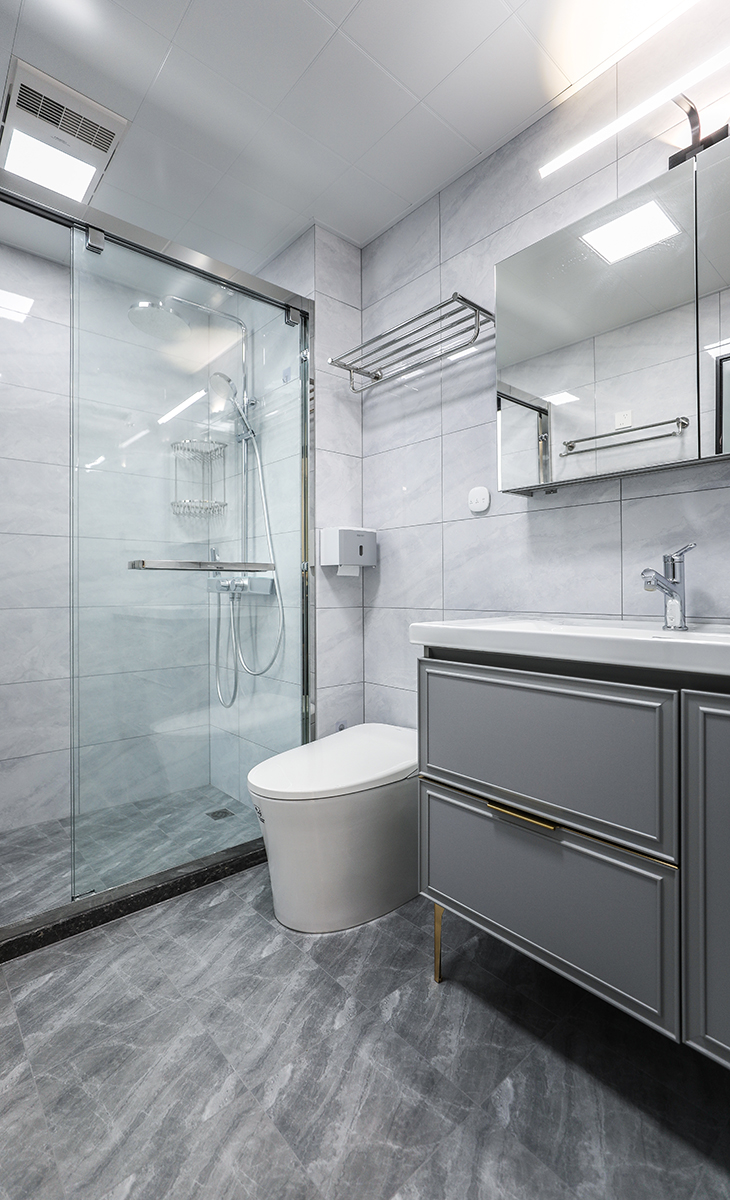 主衛生間不大,不銹鋼本色淋浴房邊框、白色馬桶,墻地一體柔光磚、白色吊頂,長虹玻璃鈦合金開門,體現主人高檔次的生活品味和優雅的審美觀。