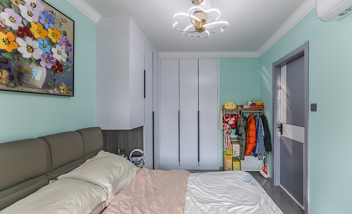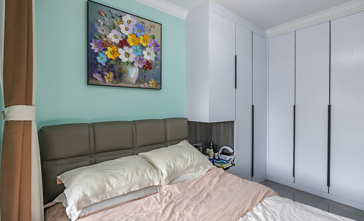 主臥采用L型柜子,讓整個空間放大,墻面刷淺綠色墻面乳膠漆,頂面白色乳膠漆,既簡單又實用。