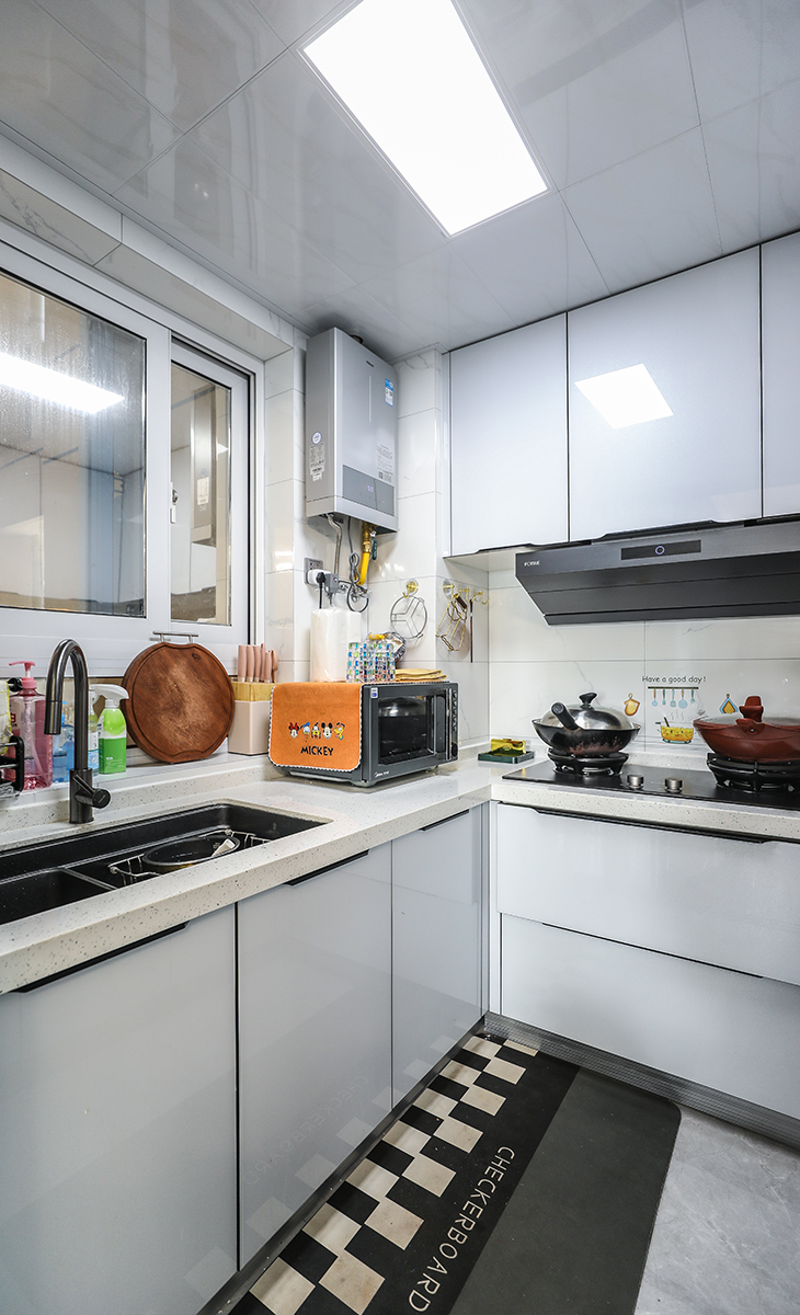 該套房子廚房空間很大,L型兩面櫥柜,另外冰箱邊上也有操作臺,顏色簡潔明快,材質要干凈和好打理,白色的吊頂和米色的櫥柜相呼應,不銹鋼臺面經久耐用,各種廚房電器全部配齊,滿足主人制作各種美食的需求。
