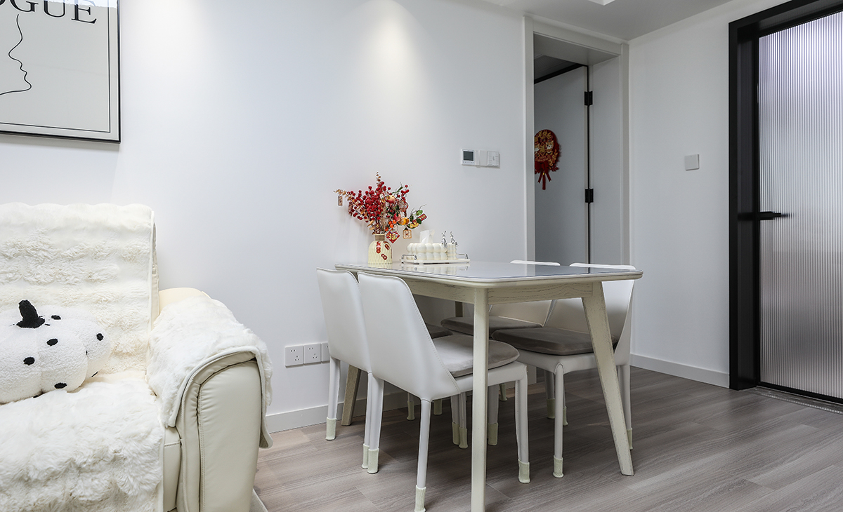餐廳放一個700*1200的小餐桌,平時家里只有2個人吃飯,夠主人用,白色巖板臺面,奶咖色桌椅,白色的椅子,上方小吊燈,很靈活輕巧,體現了主人的審美情操。