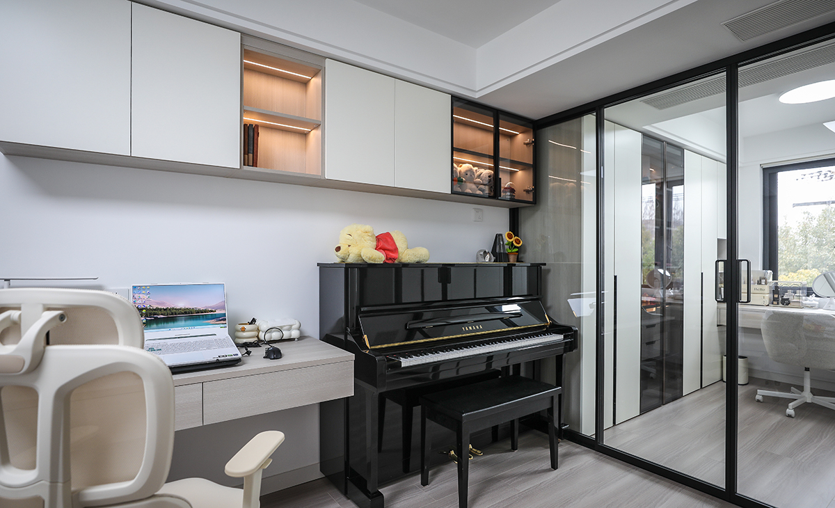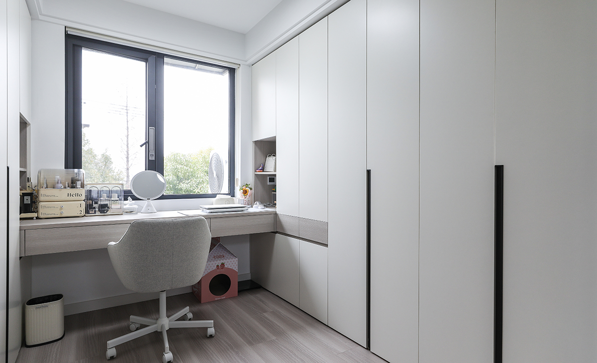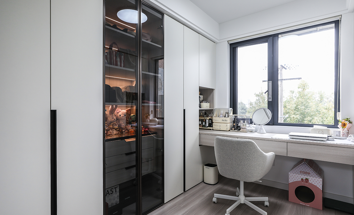 次臥整個打通做衣帽間和女主人辦公、化妝區,解決了衣柜儲物空間,工作之余抬頭就是北面綠植,很溫馨,舒適、給人感覺不僅雅致而且有韻味。