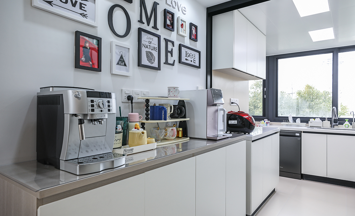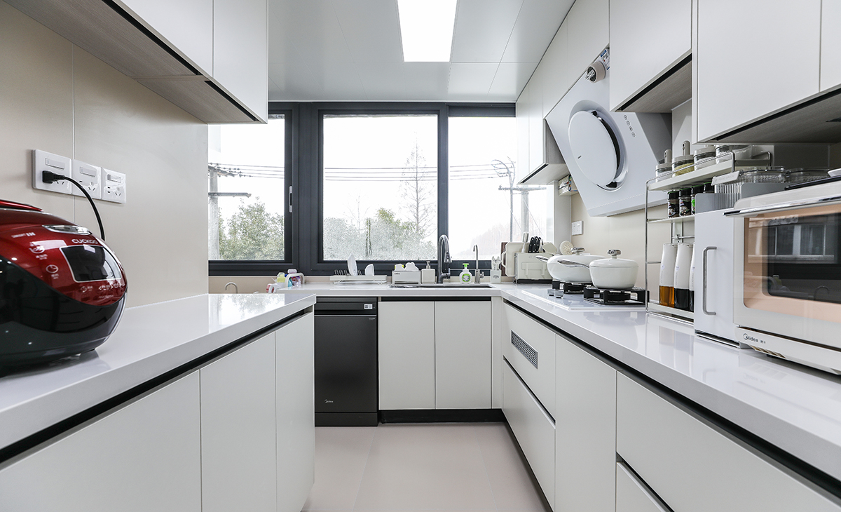 該套房子廚房空間很大,U型三面櫥柜,顏色簡潔明快,材質要干凈和好打理,白色的吊頂和米色的上櫥柜、下櫥柜相呼應,石英石臺面干凈、好打理,各種廚房電器全部配齊,滿足主人制作各種美食的需求