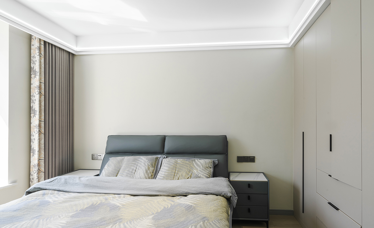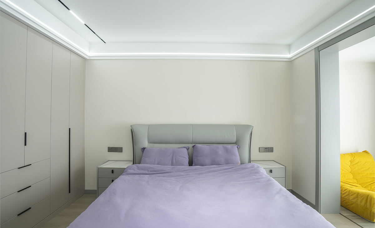 朝北女兒房也很簡潔干練,墻面涂料和衣柜的顏色搭配的恰到好處,頂面雙眼皮頂+線型燈,讓空間明亮有序。