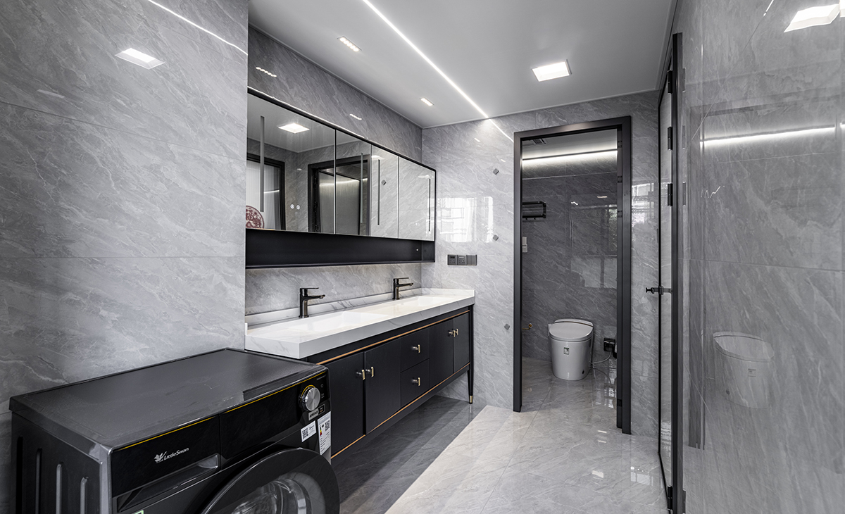 樓上衛(wèi)生間的干區(qū)設(shè)計了雙臺盆,滿足兩個人同時洗漱,深色實木臺盆和槍灰色鈦合金門套相搭,空間整體很協(xié)調(diào)、很自然。
