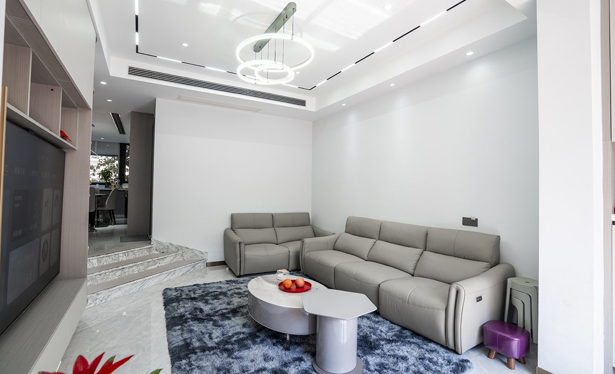 樓梯上來就是休閑區(qū),采用無主燈設(shè)計,墻面和頂面的倒U字型線燈,讓空間豐富起來,白色墻面和灰色木門搭配,光線明亮通透,顏色搭配明暗有序。